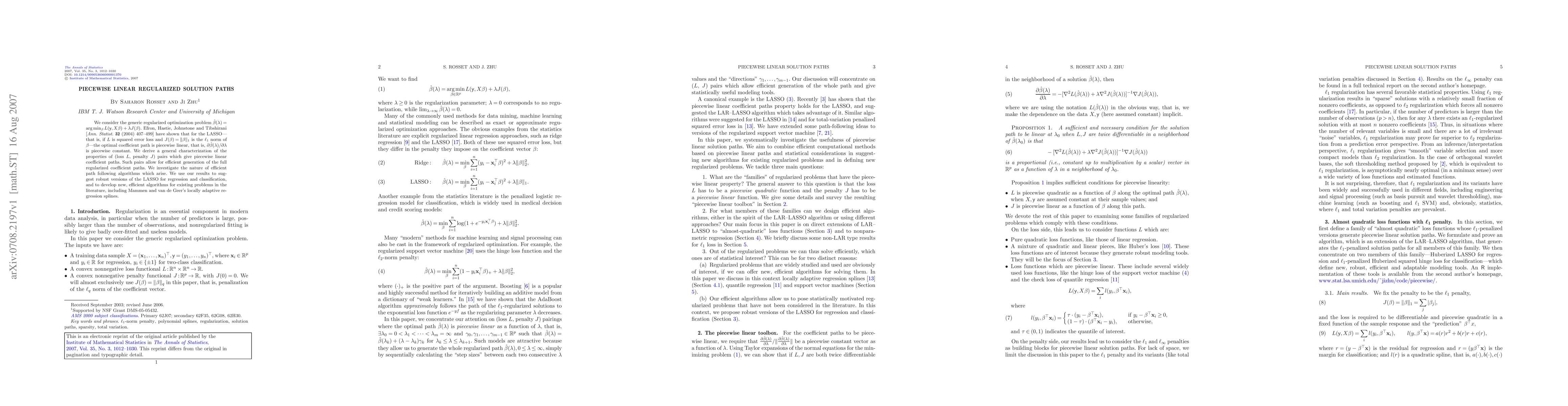 We consider the generic regularized optimization problem $\hat{\mathsf{\beta}}(\lambda)=\arg \min_{\beta}L({\sf{y}},X{\sf{\beta}})+\lambda J({\sf{\beta}})$. Efron, Hastie, Johnstone and Tibshirani [Ann. Statist. 32 (2004) 407--499] have shown that for the LASSO--that is, if $L$ is squared error loss and $J(\beta)=\|\beta\|_1$ is the $\ell_1$ norm of $\beta$--the optimal coefficient path is piecewise linear, that is, $\partial \hat{\beta}(\lambda)/\partial \lambda$ is piecewise constant. We derive a general characterization of the properties of (loss $L$, penalty $J$) pairs which give piecewise linear coefficient paths. Such pairs allow for efficient generation of the full regularized coefficient paths. We investigate the nature of efficient path following algorithms which arise. We use our results to suggest robust versions of the LASSO for regression and classification, and to develop new, efficient algorithms for existing problems in the literature, including Mammen and van de Geer's locally adaptive regression splines.
