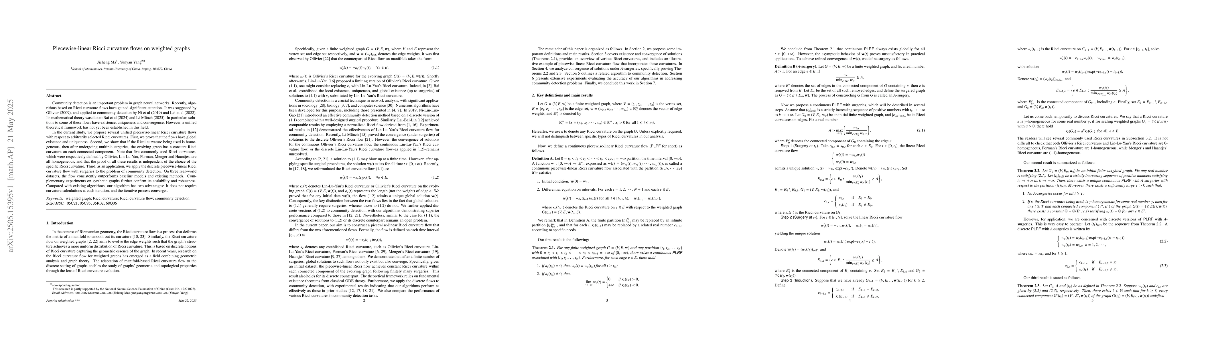 The paper proposes piecewise-linear Ricci curvature flows on weighted graphs, proving global existence and uniqueness, demonstrating constant Ricci curvature on each connected component after surgeries when using homogeneous Ricci curvature, and applying the flow to community detection in graph neural networks.