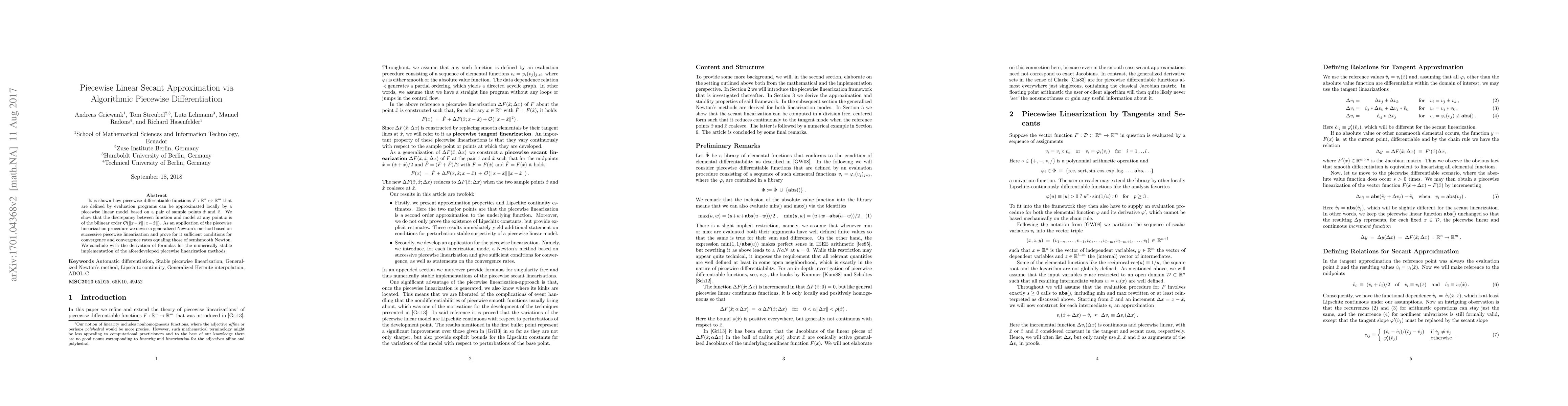 It is shown how piecewise differentiable functions $F: \mathbb R^n \mapsto \mathbb R^m $ that are defined by evaluation programs can be approximated locally by a piecewise linear model based on a pair of sample points $\check x$ and $\hat x$. We show that the discrepancy between function and model at any point $x$ is of the bilinear order $O(\|x-\check x\| \|x-\hat x\|)$. This is a little surprising since $x \in \mathbb R^n$ may vary over the whole Euclidean space, and we utilize only two function samples $\check F=F(\check x)$ and $\hat F=F(\hat x)$, as well as the intermediates computed during their evaluation. As an application of the piecewise linearization procedure we devise a generalized Newton's method based on successive piecewise linearization and prove for it sufficient conditions for convergence and convergence rates equaling those of semismooth Newton. We conclude with the derivation of formulas for the numerically stable implementation of the aforedeveloped piecewise linearization methods.