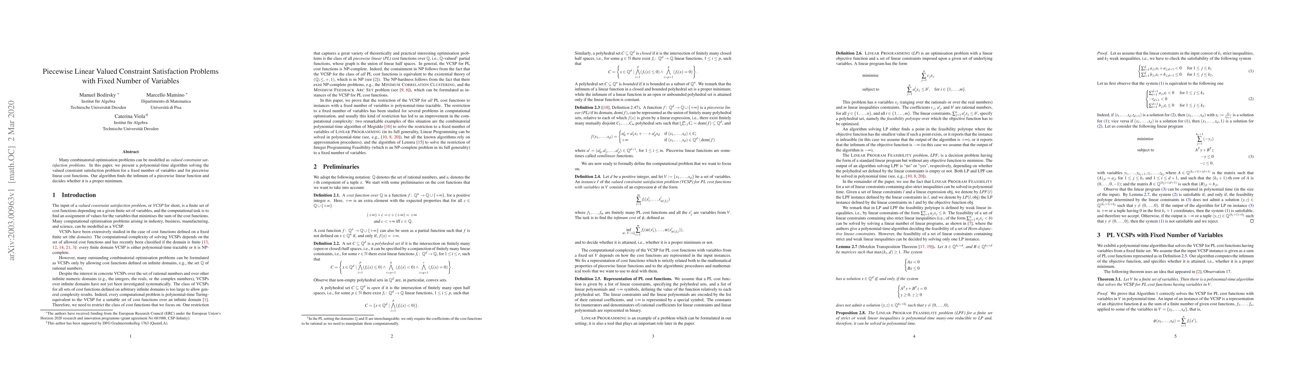 Summary: This paper introduces a polynomial-time algorithm to solve valued constraint satisfaction problems with a fixed number of variables and piecewise linear cost functions, determining the infimum and verifying if it is a proper minimum.