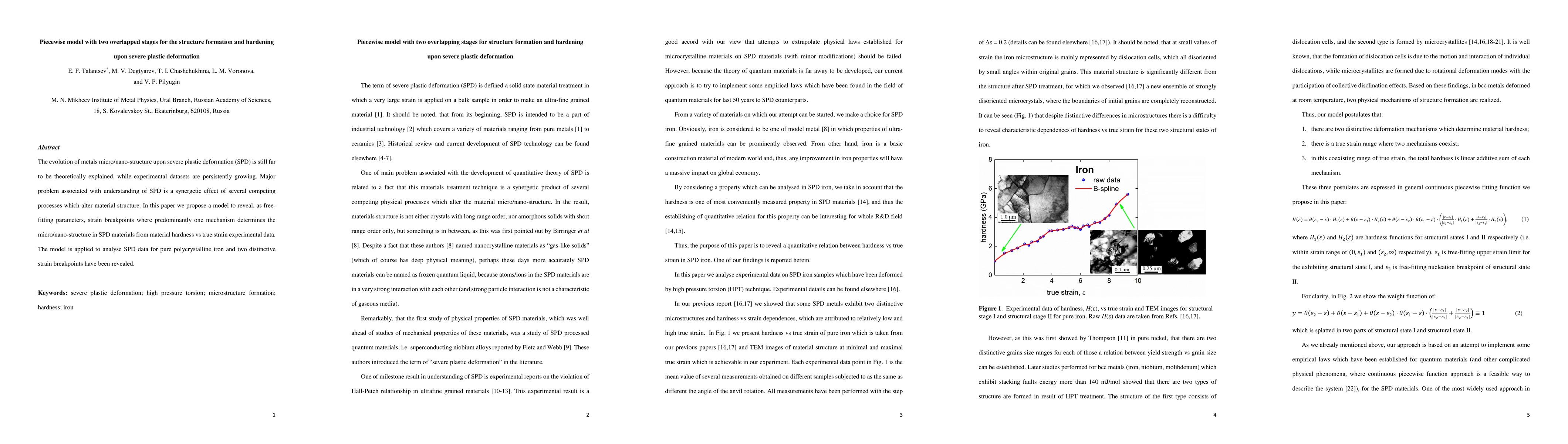 This paper proposes a piecewise model to understand the micro/nano-structure formation in metals under severe plastic deformation (SPD). The model identifies strain breakpoints from hardness vs true strain data, revealing the dominant mechanisms at different stages in SPD materials, as demonstrated with pure polycrystalline iron.