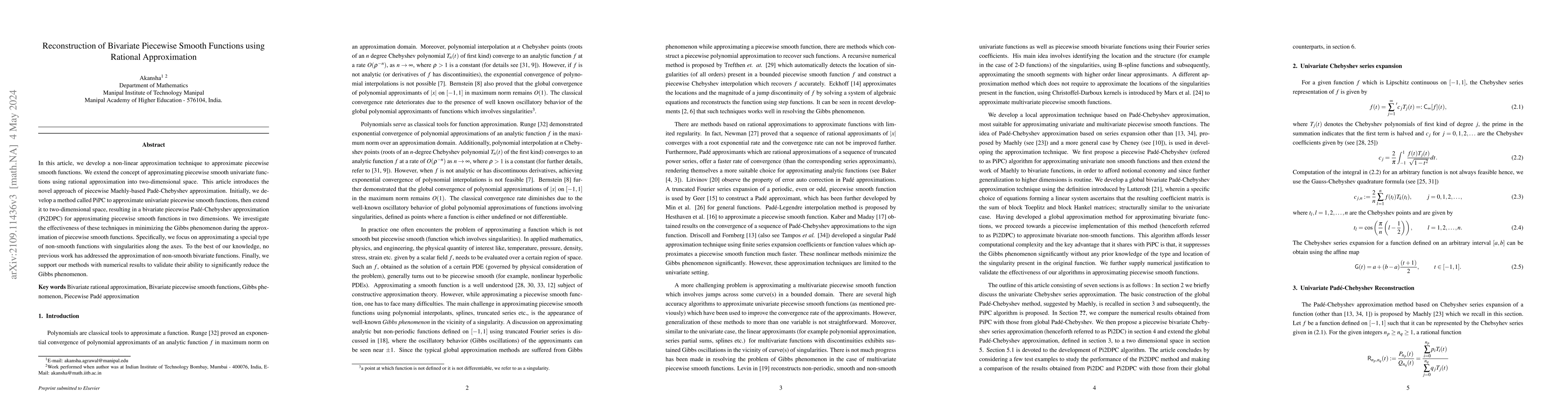 We extend the idea of approximating piecewise smooth univariate functions using rational approximation introduced in \cite{aka_bas-19a} to two-dimensional space. This article aims to implement the novel piecewise Maehly based Pad\'e-Chebyshev approximation \cite{mae_60a}. We first develop a method referred to as PiPC to approximate univariate piecewise smooth functions and then extend the same to a two-dimensional space, leading to a bivariate piecewise Pad\'e-Chebyshev approximation (Pi2DPC) for approximating piecewise smooth functions in two-dimension. We study the utility of the proposed techniques in minimizing the Gibbs phenomenon while approximating piecewise smooth functions. The chief advantage of these methods lies in their non-dependence on any apriori knowledge of the locations and types of singularities (if any) present in the original function. Finally, we supplement our methods with numerical results to validate their effectiveness in diminishing the Gibbs phenomenon to negligible levels.