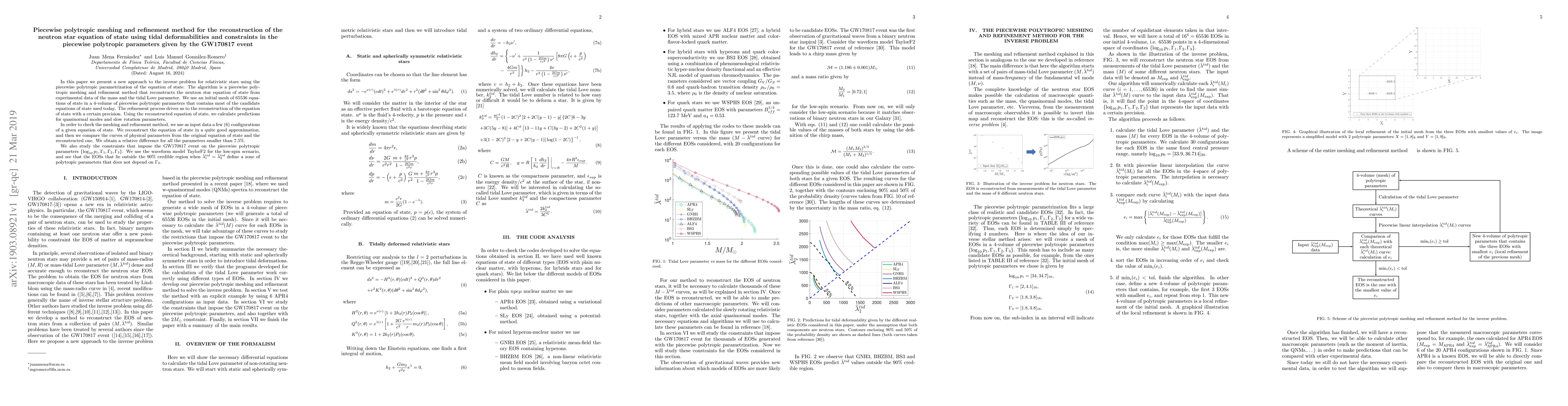 In this paper we present a new approach to the inverse problem for relativistic stars using the piecewise polytropic parametrization of the equation of state. The algorithm is a piecewise polytropic meshing and refinement method that reconstructs the neutron star equation of state from experimental data of the mass and the tidal Love parameter. We use an initial mesh of 65536 equations of state in a 4-volume of piecewise polytropic parameters that contains most of the candidate equations of state used today. The refinement process drives us to the reconstruction of the equation of state with a certain precision. Using the reconstructed equation of state, we calculate predictions for quasinormal modes and slow rotation parameters. In order to check the meshing and refinement method, we use as input data a few (6) configurations of a given equation of state. We reconstruct the equation of state in a quite good approximation, and then we compare the curves of physical parameters from the original equation of state and the reconstructed one. We obtain a relative difference for all the parameters smaller than 7.5%. We also study the constraints that impose the GW170817 event on the piecewise polytropic parameters $\{{\log_{10}p_1},{\Gamma_1},{\Gamma_2},{\Gamma_3}\}$. We use the waveform model TaylorF2 for the low-spin scenario, and see that the EOSs that lie outside the 90% credible region when ${\bar{\lambda}^{tid}_1}={\bar{\lambda}^{tid}_2}$ define a zone of polytropic parameters that does not depend on ${\Gamma_3}$.