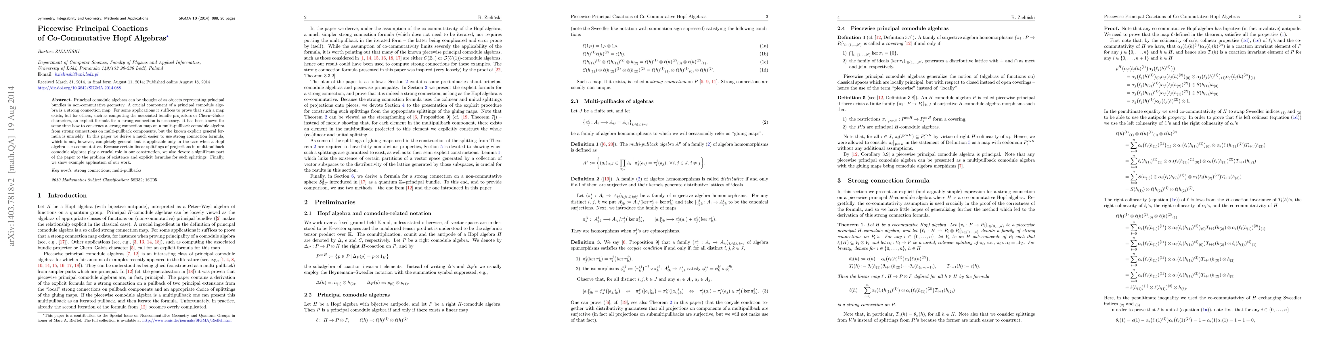 This paper develops a simplified strong connection formula for principal comodule algebras in co-commutative Hopf algebras, addressing the need for explicit formulas in applications like computing bundle projectors. It also explores linear splittings of projections in multi-pullback comodule algebras to support the construction.