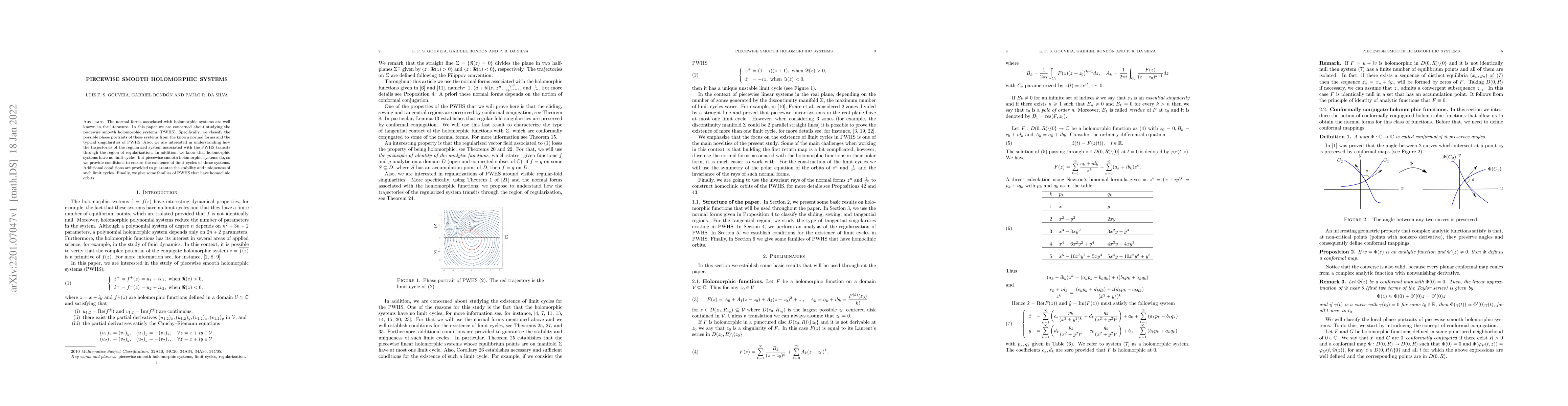 The paper studies piecewise smooth holomorphic systems (PWHS), classifying their phase portraits using known normal forms and singularities. It explores the existence of limit cycles in PWHS, providing conditions for their stability and uniqueness, and examines the trajectories' transition through the regularization region.