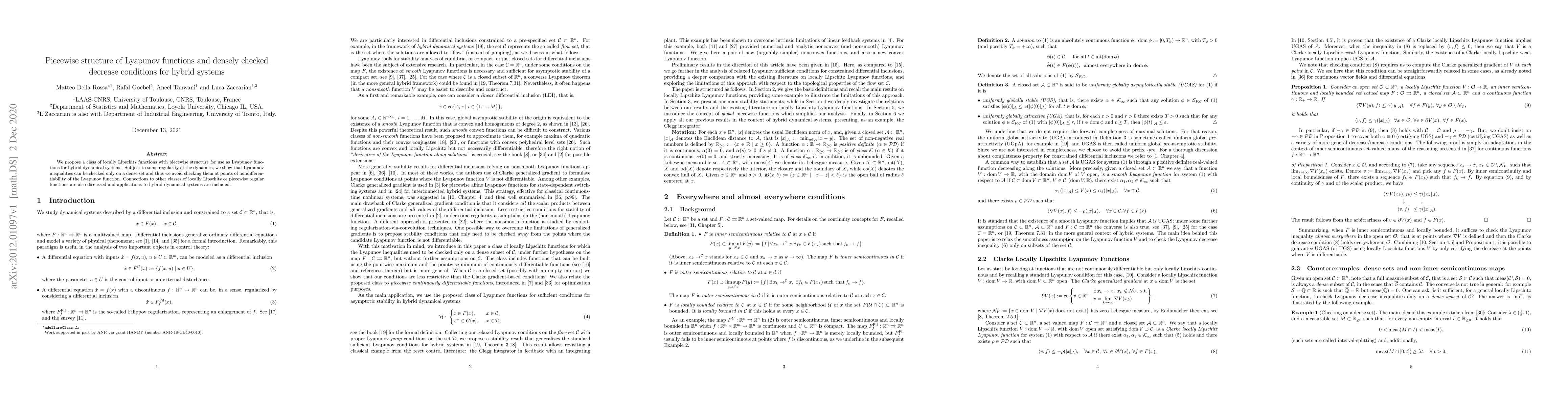 This paper introduces a piecewise Lipschitz Lyapunov function for hybrid systems that only requires checking inequalities on a dense set, avoiding points of nondifferentiability. It discusses connections to other function classes and demonstrates applications to hybrid dynamical systems.