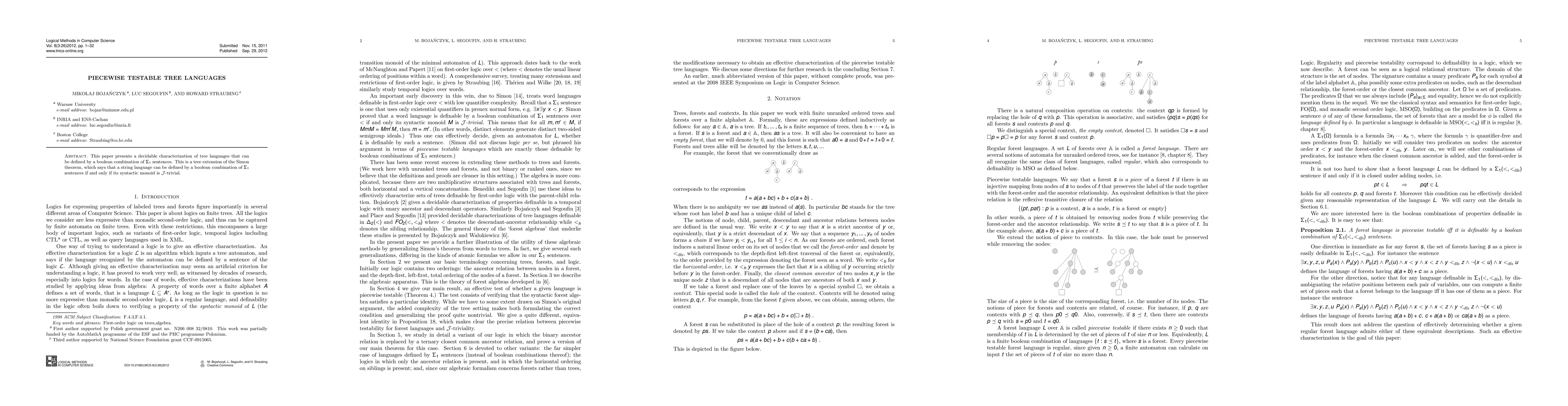 This paper characterizes decidable tree languages defined by boolean combinations of Sigma_1 sentences, extending Simon's theorem for string languages to the tree domain. It establishes a decidable framework for these piecewise testable tree languages.