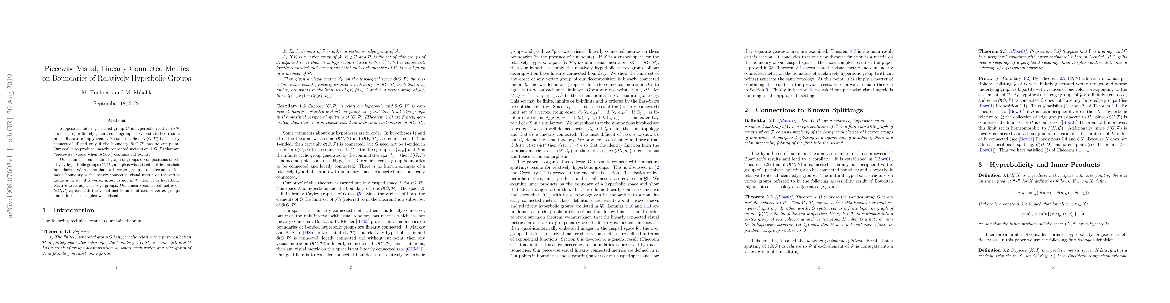 Suppose a finitely generated group $G$ is hyperbolic relative to $\mathcal P$ a set of proper finitely generated subgroups of $G$. Established results in the literature imply that a "visual" metric on $\partial (G,\mathcal P)$ is "linearly connected" if and only if the boundary $\partial (G,\mathcal P)$ has no cut point. Our goal is to produce linearly connected metrics on $\partial (G,\mathcal P)$ that are "piecewise" visual when $\partial (G,\mathcal P)$ contains cut points. %Visual metrics for $\partial (G,\mathcal P)$ are tightly linked to inner products of geodesic rays in "cusped" spaces for $(G,\mathcal P)$. The identity vertex $\ast$ is usually our base point in these cusped spaces and visual metrics depend on this base point. %We say the visual metric $d_p$ on $\partial(G,\mathcal P)$, with base point $p$, is {\it $G$-equivariant} if for points $x_1,x_2\in \partial(G,\mathcal P)$, we have $d_p(x_1,x_2)=d_{gp}(gx_1,gx_2)$ for all $g\in G$. Our main theorem is about graph of groups decompositions of relatively hyperbolic groups $(G,\mathcal P)$, and piecewise visual metrics on their boundaries. We assume that each vertex group of our decomposition has a boundary with linearly connected visual metric or the vertex group is in $\mathcal P$. If a vertex group is not in $\mathcal P$, then it is hyperbolic relative to its adjacent edge groups. Our linearly connected metric on $\partial (G,\mathcal P)$ agrees with the visual metric on limit sets of vertex groups and is in this sense piecewise visual.