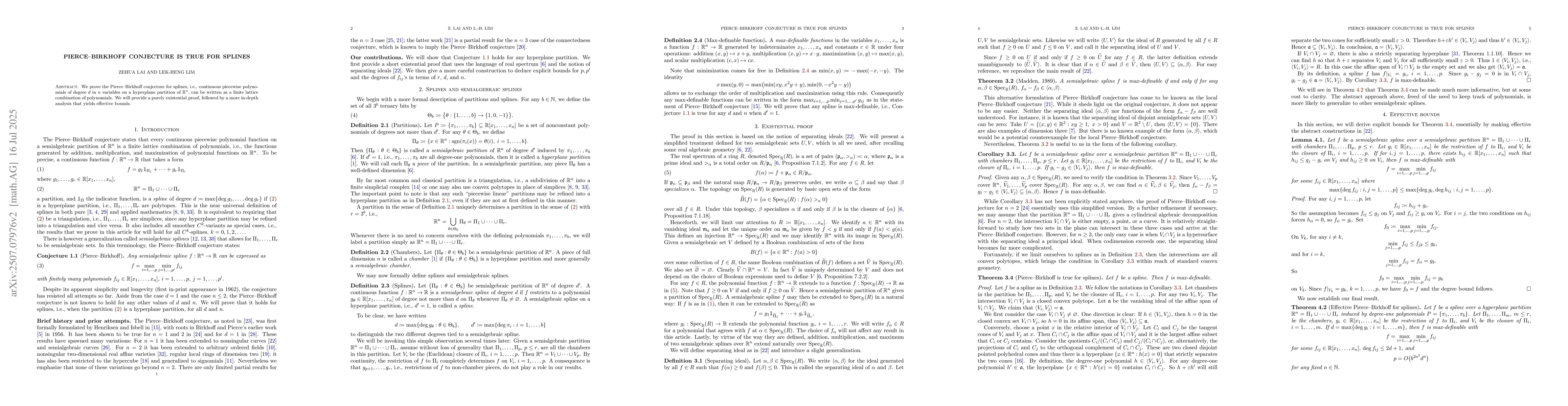 We prove the Pierce--Birkhoff conjecture for splines, i.e., continuous piecewise polynomials of degree $d$ in $n$ variables on a hyperplane partition of $\mathbb{R}^n$, can be written as a finite lattice combination of polynomials. We will provide a purely existential proof, followed by a more in-depth analysis that yields effective bounds.