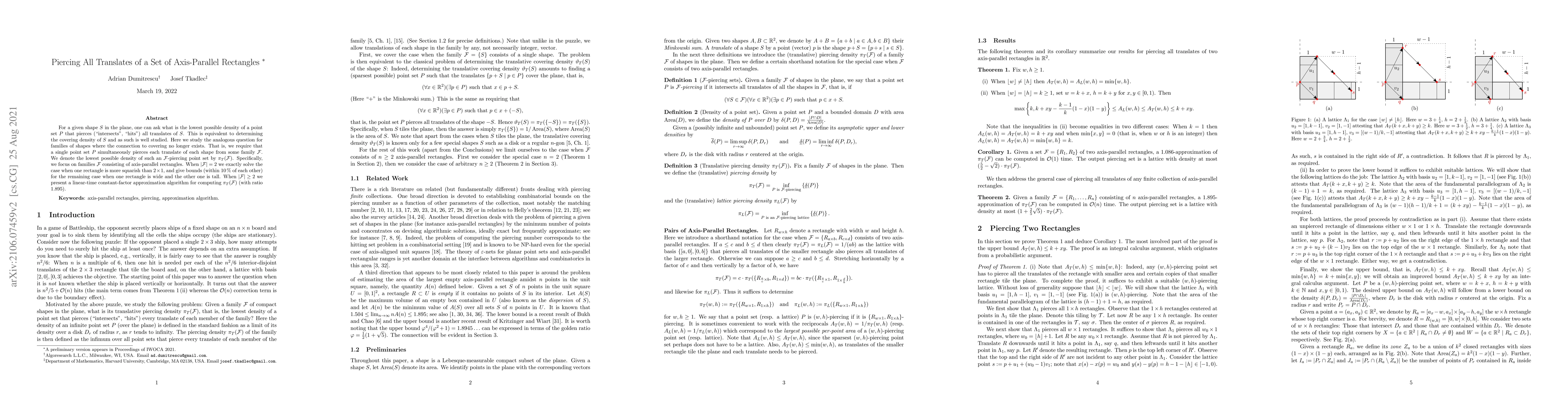 This paper investigates the minimum density of a point set that can pierce all translates of a family of axis-parallel rectangles, denoted as $\pi_T(\mathcal F)$. For two rectangles, it provides exact solutions and bounds for different configurations, and for larger families, it presents a linear-time approximation algorithm with a constant factor of 1.895.