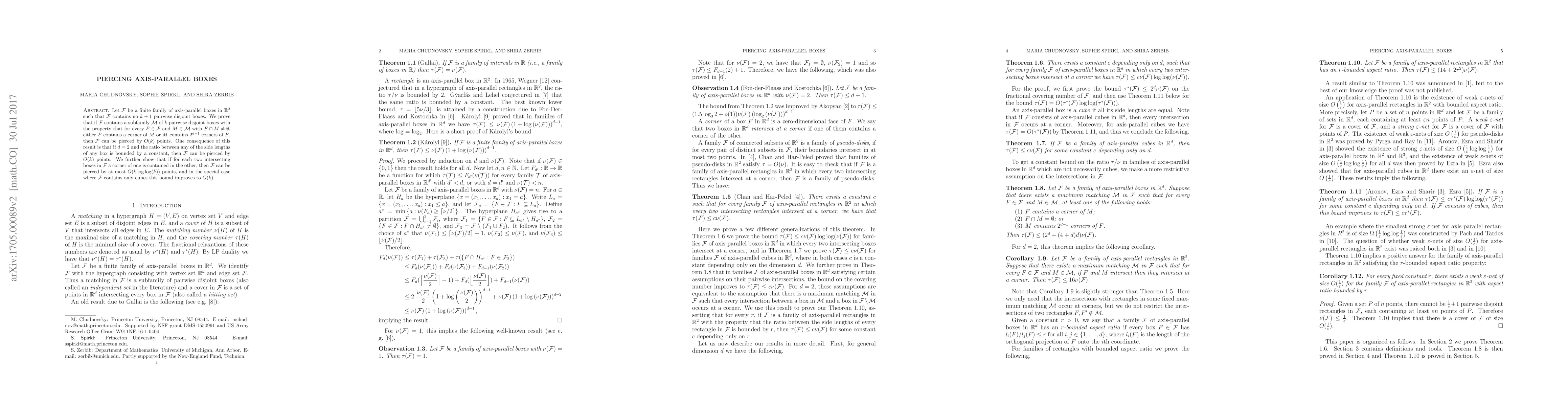 This paper proves that a finite family of axis-parallel boxes in $\R^d$ can be pierced by $O(k)$ points if it contains a subfamily of $k$ pairwise disjoint boxes with specific intersection properties. It also establishes tighter piercing bounds for $d=2$ and families of cubes.