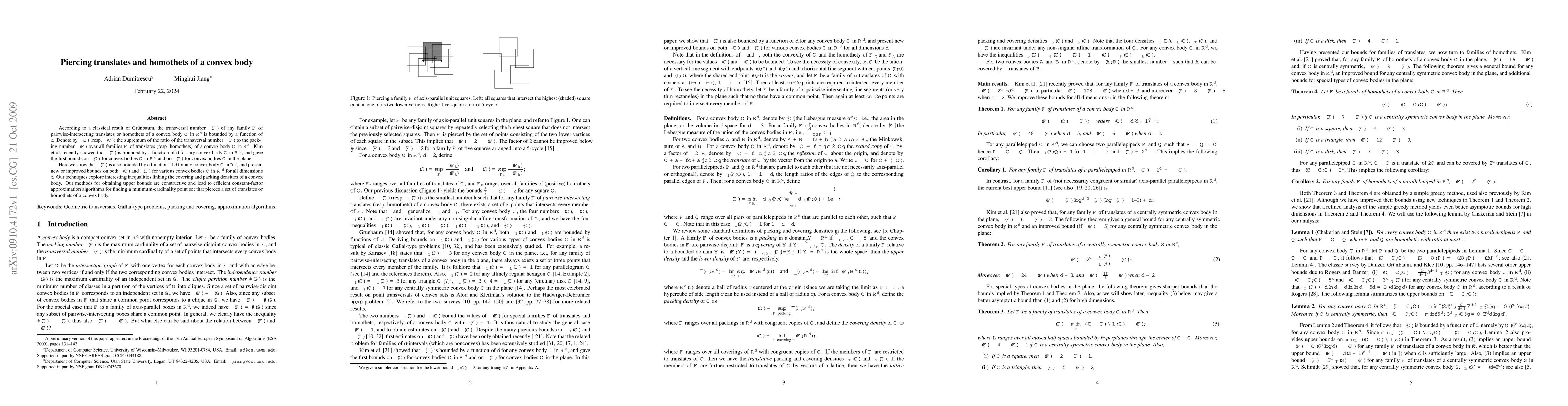 This paper extends the study of the transversal and packing numbers of convex bodies in $\mathbb{R}^d$, showing that the ratio $\beta(C)$ of transversal to packing numbers is bounded by a function of $d$. It also provides new or improved bounds on both $\alpha(C)$ and $\beta(C)$ and develops efficient algorithms for finding a minimum-cardinality point set that pierces translates or homothets of a convex body.