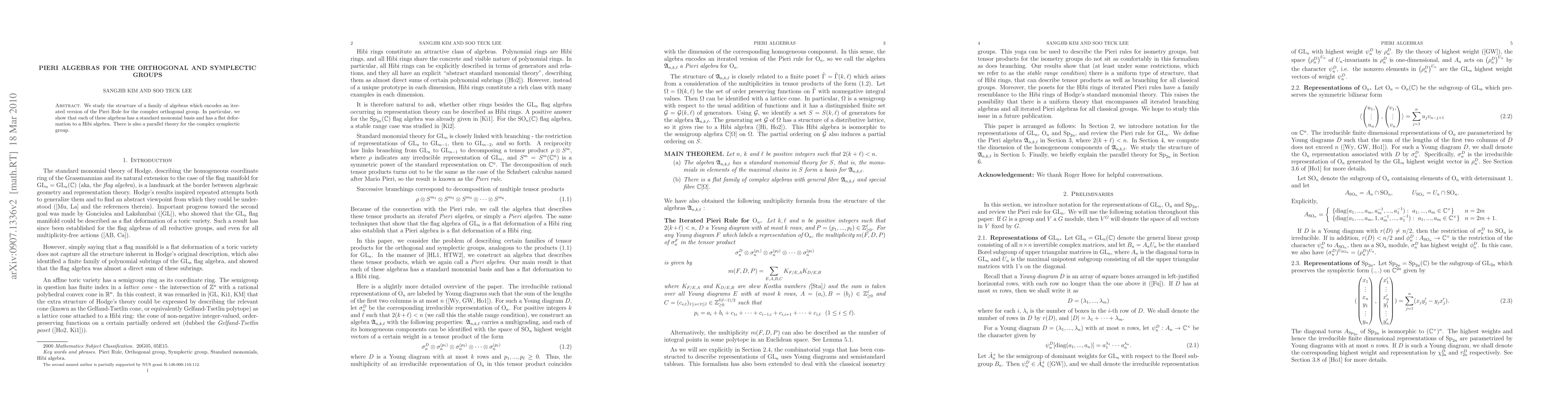 This paper investigates a family of algebras that generalize the Pieri Rule for the complex orthogonal group, showing they possess a standard monomial basis and can be deformed into Hibi algebras. A corresponding theory is also developed for the complex symplectic group.