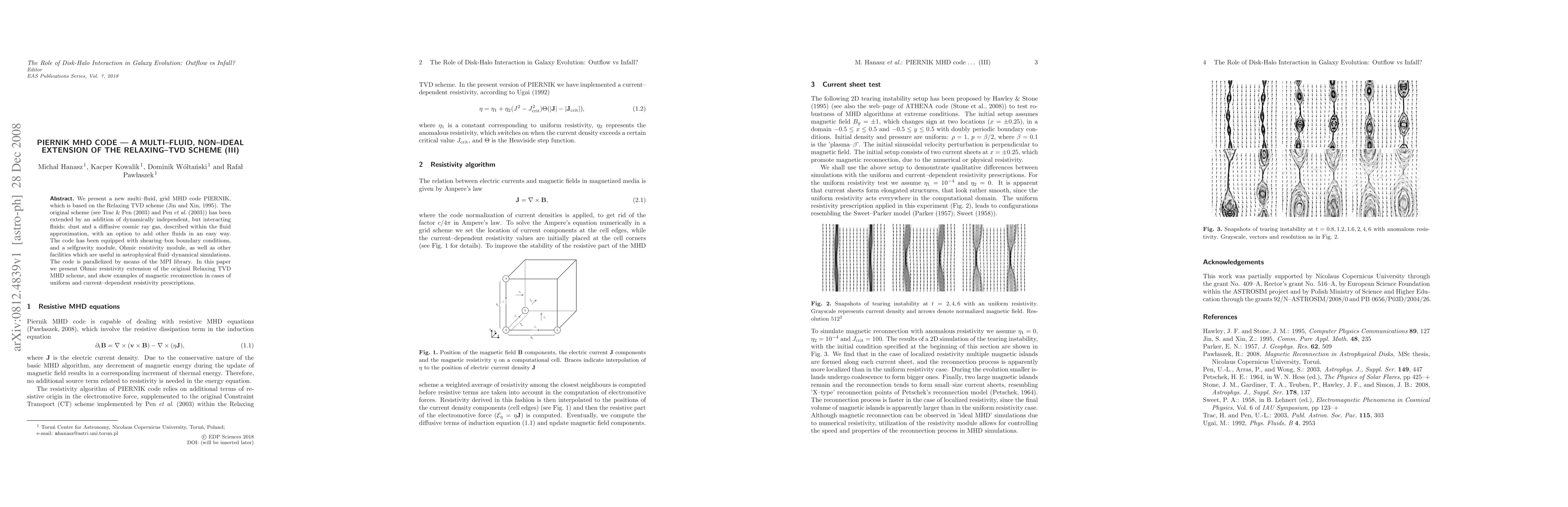 A new multi-fluid MHD code called PIERNIK extends the Relaxing TVD scheme with dust and cosmic ray gas, demonstrating magnetic reconnection in uniform and current-dependent resistivity cases.