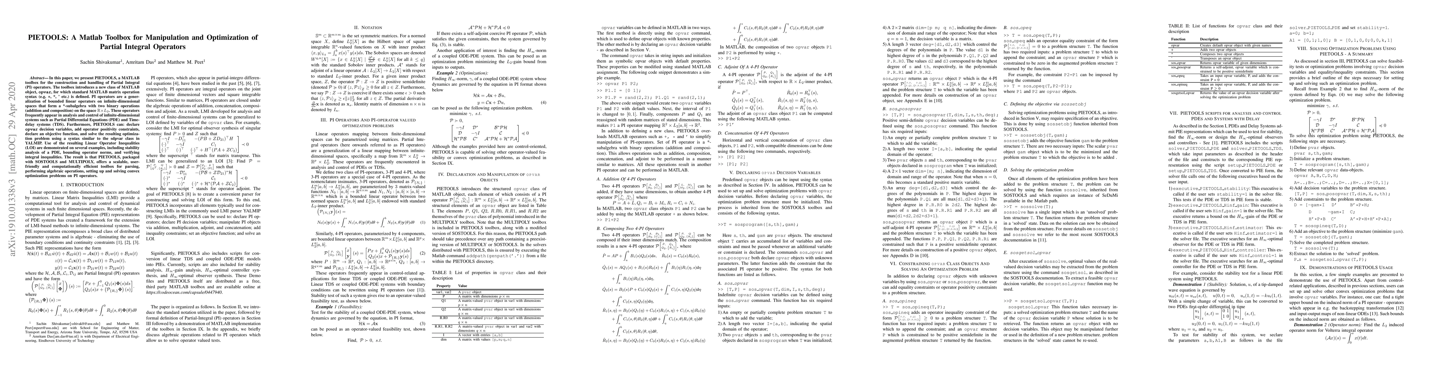 PIETOOLS is a MATLAB toolbox for constructing and optimizing Partial Integral operators, introducing an "opvar" class for matrix operations and enabling optimization of infinite-dimensional systems like PDEs and TDS. It provides tools for setting up and solving convex optimization problems involving Linear Operator Inequalities.