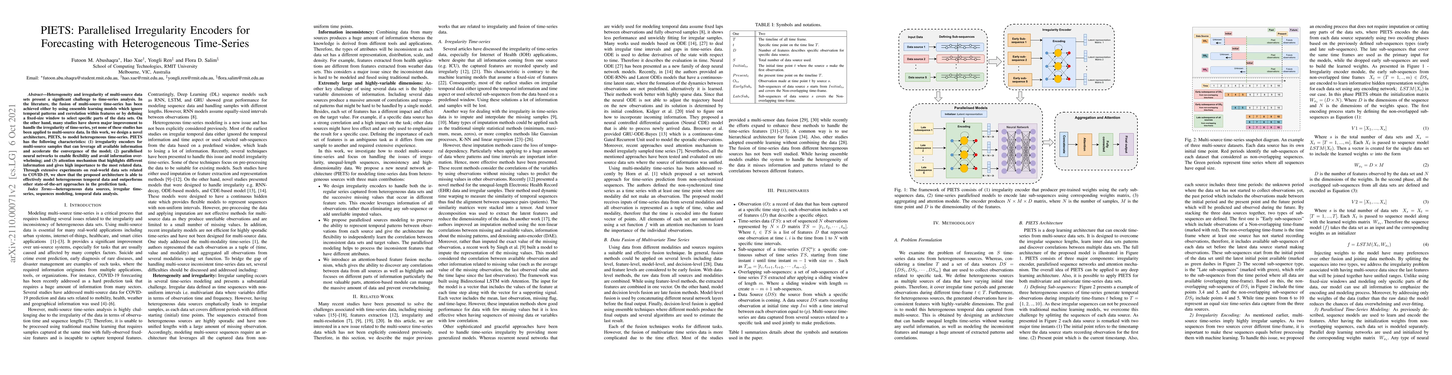 PIETS introduces irregularity encoders and parallelised neural networks to model heterogeneous time-series data, effectively leveraging all available information and improving convergence. Experiments demonstrate its superior performance in forecasting compared to existing methods.