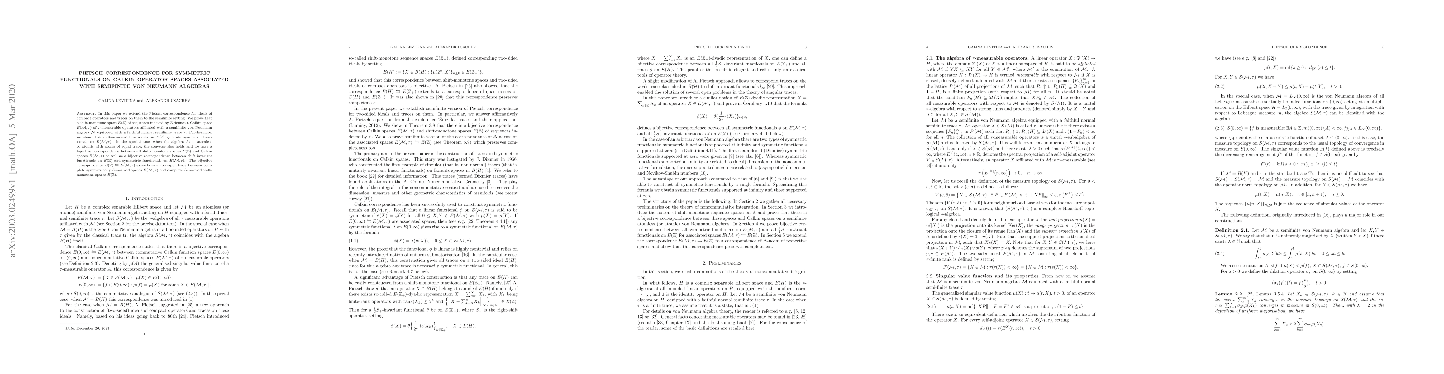 This paper extends the Pietsch correspondence to semifinite von Neumann algebras, showing that shift-monotone spaces $E(\Z)$ define Calkin spaces $E(\cM,\tau)$ of $\tau$-measurable operators. It establishes a bijective correspondence between shift-monotone spaces and symmetric functionals, valid under specific conditions on the algebra $\cM$.