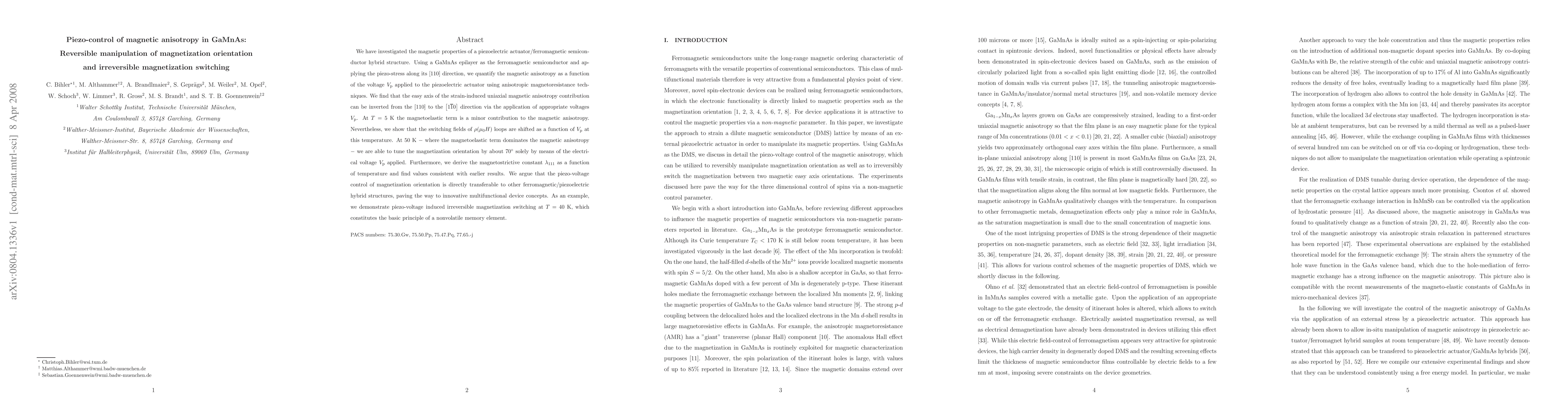 This research explores the manipulation of magnetic anisotropy in GaMnAs via piezo-stress applied through a piezoelectric actuator, showing reversible changes in magnetization orientation and irreversible magnetization switching at different temperatures. The findings suggest broad applicability to multifunctional device concepts, including nonvolatile memory elements.