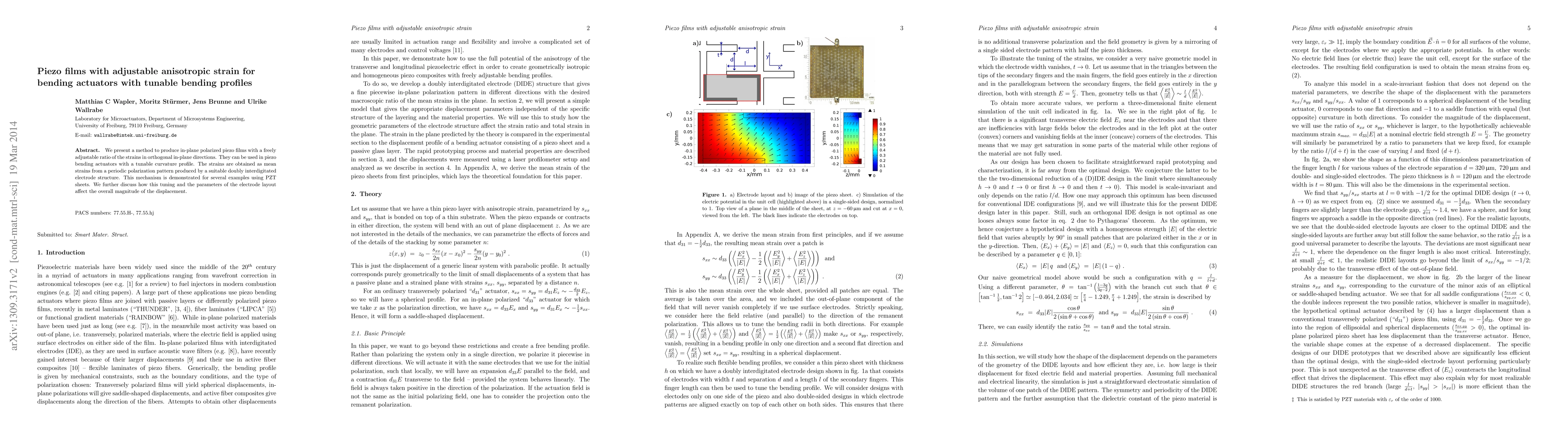 This paper introduces a novel method for creating piezo films with adjustable anisotropic strain, enabling tunable bending profiles in actuators. The films achieve this through a periodic polarization pattern controlled by a doubly interdigitated electrode, demonstrated effectively using PZT sheets, and discuss the impact of electrode parameters on displacement magnitude.