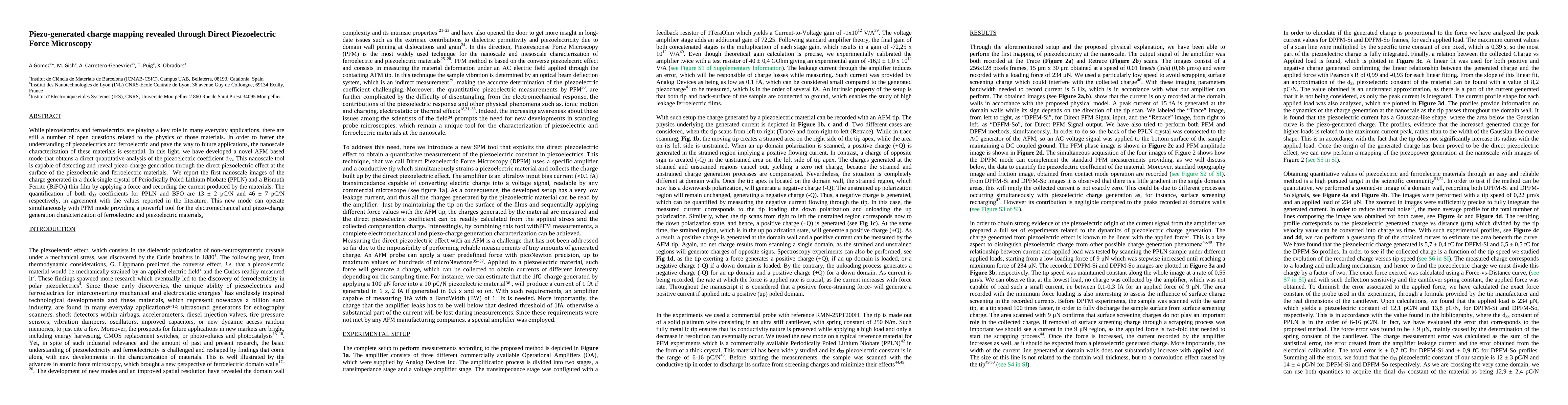 While piezoelectrics and ferroelectrics are playing a key role in many everyday applications, there are still a number of open questions related to the physics of those materials. In order to foster the understanding of piezoelectrics and ferroelectric and pave the way to future applications, the nanoscale characterization of these materials is essential. In this light, we have developed a novel AFM based mode that obtains a direct quantitative analysis of the piezoelectric coefficient d33. This nanoscale tool is capable of detecting and reveal piezo-charge generation through the direct piezoelectric effect at the surface of the piezoelectric and ferroelectric materials. We report the first nanoscale images of the charge generated in a thick single crystal of Periodically Poled Lithium Niobate (PPLN) and a Bismuth Ferrite (BiFO3) thin film by applying a force and recording the current produced by the materials. The quantification of both d33 coefficients for PPLN and BFO are 13 +- 2 pC/N and 46 +- 7 pC/N respectively, in agreement with the values reported in the literature. This new mode can operate simultaneously with PFM mode providing a powerful tool for the electromechanical and piezo-charge generation characterization of ferroelectric and piezoelectric materials.