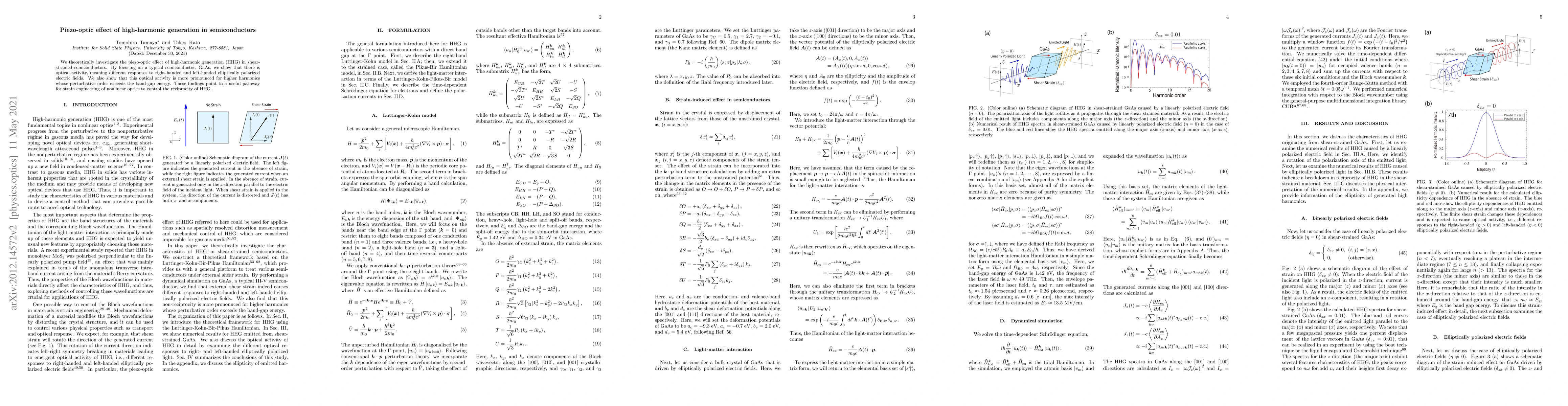 This paper explores the piezo-optic effect in high-harmonic generation (HHG) within shear-strained semiconductors, specifically GaAs, revealing optical activity and enhanced responses to different polarized electric fields at higher harmonics. The study suggests a method for strain engineering to control the reciprocity of HHG in nonlinear optics.