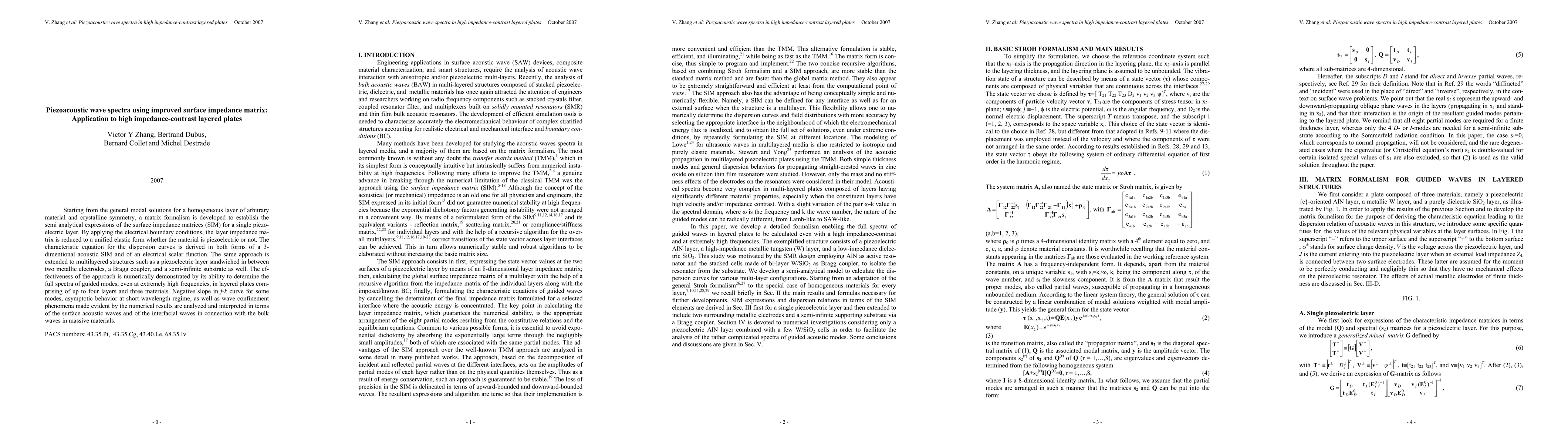 Starting from the general modal solutions for a homogeneous layer of arbitrary material and crystalline symmetry, a matrix formalism is developed to establish the semi analytical expressions of the surface impedance matrices (SIM) for a single piezo-electric layer. By applying the electrical boundary conditions, the layer impedance matrix is reduced to a unified elastic form whether the material is piezoelectric or not. The characteristic equation for the dispersion curves is derived in both forms of a 3-dimentional acoustic SIM and of an electrical scalar function. The same approach is extended to multilayered structures such as a piezoelectric layer sandwiched in between two metallic electrodes, a Bragg coupler, and a semi-infinite substrate as well. The effectiveness of the approach is numerically demonstrated by its ability to determine the full spectra of guided modes, even at extremely high frequencies, in layered plates comprising of up to four layers and three materials. Negative slope in f-k curve for some modes, asymptotic behavior at short wavelength regime, as well as wave confinement phenomena made evident by the numerical results are analyzed and interpreted in terms of the surface acoustic waves and of the interfacial waves in connection with the bulk waves in massive materials.