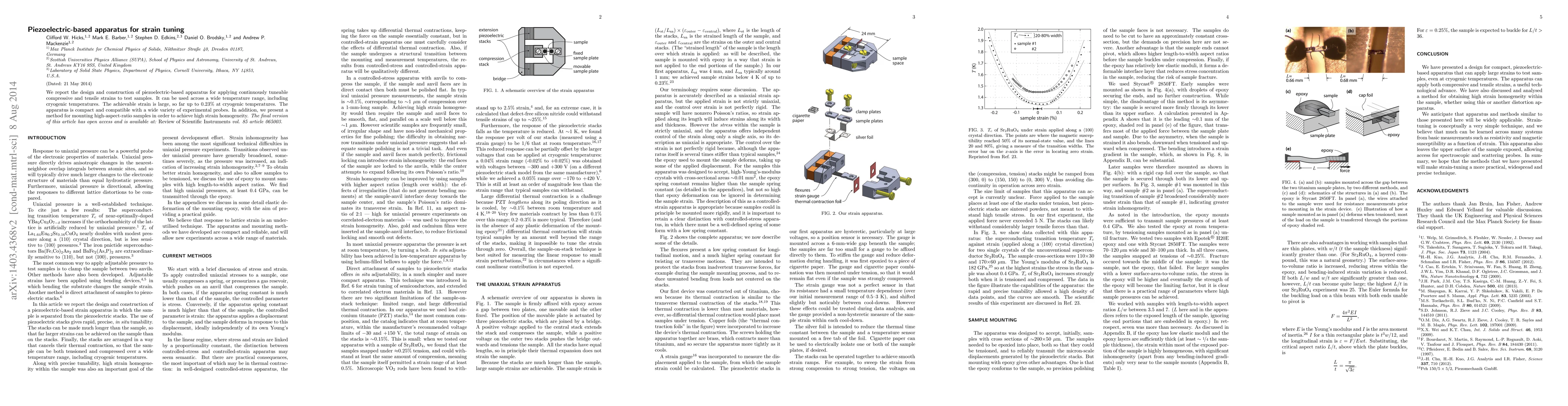 We report the design and construction of piezoelectric-based apparatus for applying continuously tuneable compressive and tensile strains to test samples. It can be used across a wide temperature range, including cryogenic temperatures. The achievable strain is large, so far up to 0.23% at cryogenic temperatures. The apparatus is compact and compatible with a wide variety of experimental probes. In addition, we present a method for mounting high-aspect-ratio samples in order to achieve high strain homogeneity.