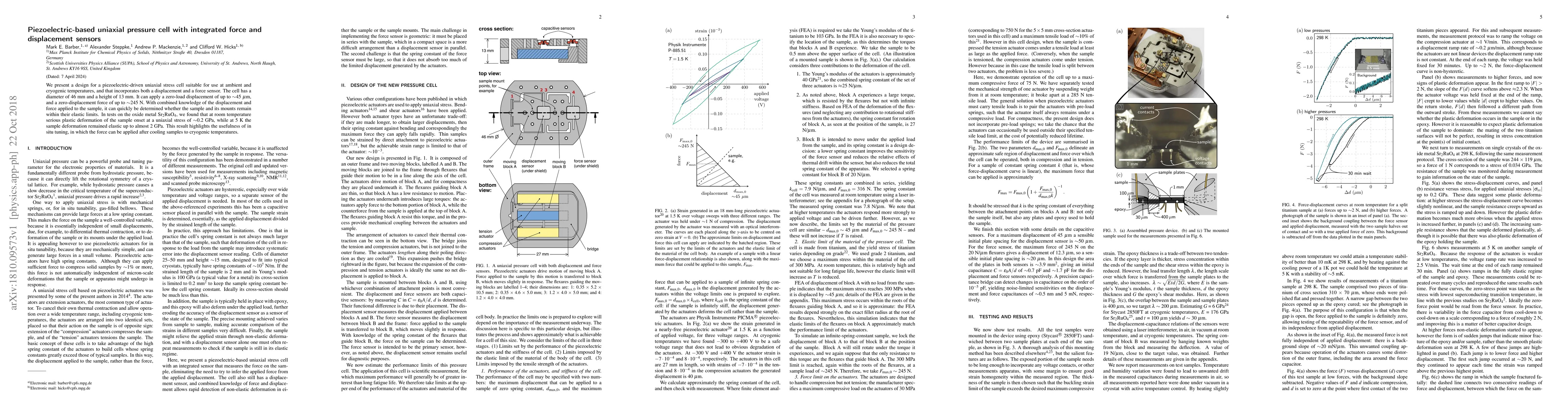 We present a design for a piezoelectric-driven uniaxial stress cell suitable for use at ambient and cryogenic temperatures, and that incorporates both a displacement and a force sensor. The cell has a diameter of 46 mm and a height of 13 mm. It can apply a zero-load displacement of up to ~45 $\mu$m, and a zero-displacement force of up to ~245 N. With combined knowledge of the displacement and force applied to the sample, it can quickly be determined whether the sample and its mounts remain within their elastic limits. In tests on the oxide metal Sr$_2$RuO$_4$, we found that at room temperature serious plastic deformation of the sample onset at a uniaxial stress of ~0.2 GPa, while at 5 K the sample deformation remained elastic up to almost 2 GPa. This result highlights the usefulness of in situ tuning, in which the force can be applied after cooling samples to cryogenic temperatures.
