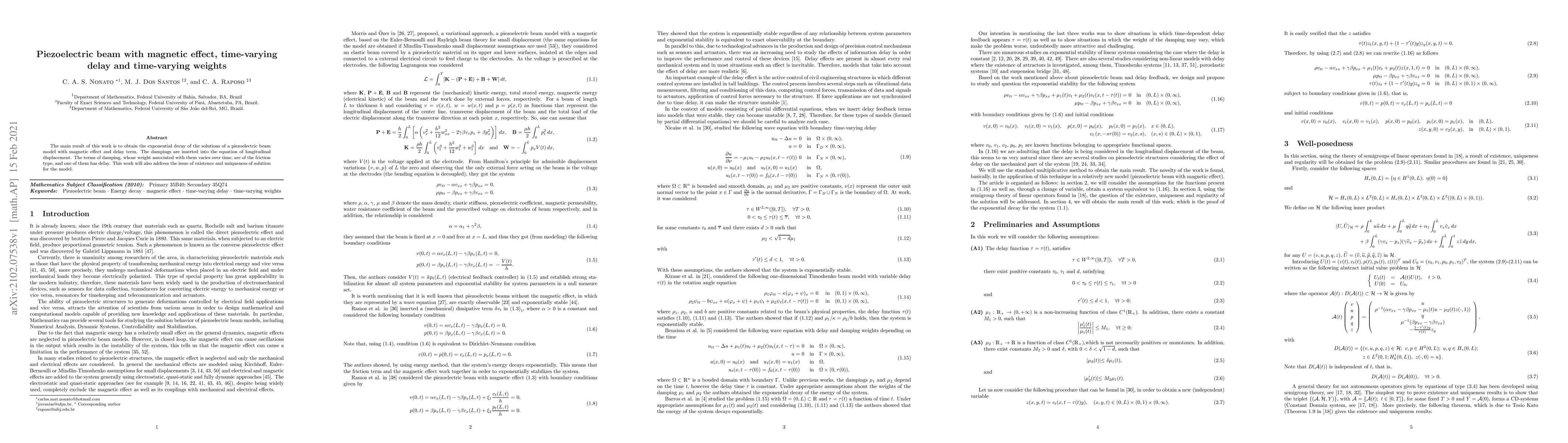 This paper investigates the exponential decay of solutions for a piezoelectric beam model with magnetic effects, time-varying delay, and time-varying frictional damping. It also addresses the existence and uniqueness of solutions for the proposed model.