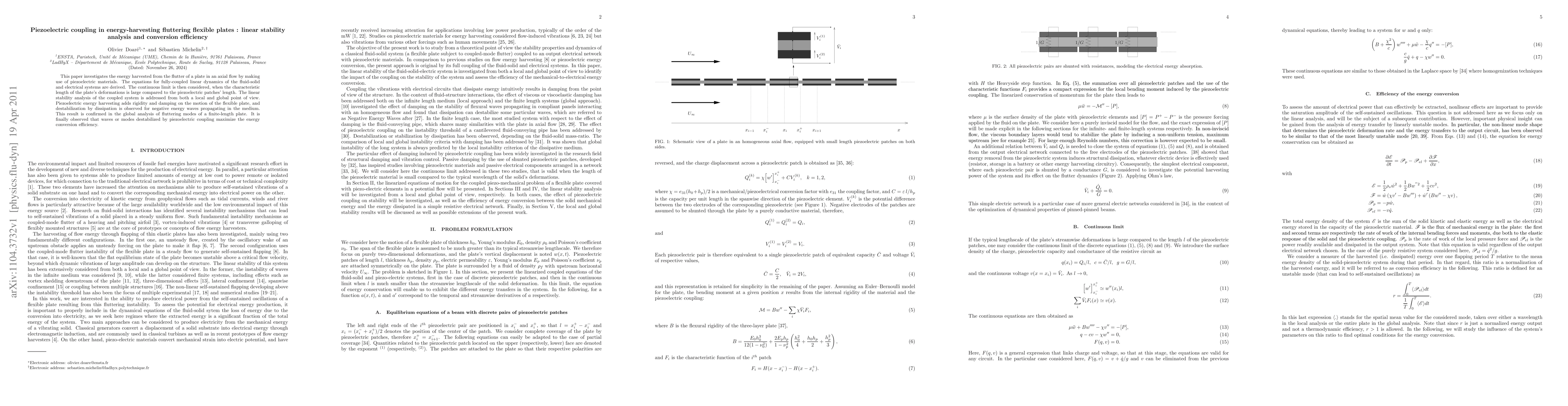 This paper investigates the energy harvested from the flutter of a plate in an axial flow by making use of piezoelectric materials. The equations for fully-coupled linear dynamics of the fluid-solid and electrical systems are derived. The continuous limit is then considered, when the characteristic length of the plate's deformations is large compared to the piezoelectric patches' length. The linear stability analysis of the coupled system is addressed from both a local and global point of view. Piezoelectric energy harvesting adds rigidity and damping on the motion of the flexible plate, and destabilization by dissipation is observed for negative energy waves propagating in the medium. This result is confirmed in the global analysis of fluttering modes of a finite-length plate. It is finally observed that waves or modes destabilized by piezoelectric coupling maximize the energy conversion efficiency.