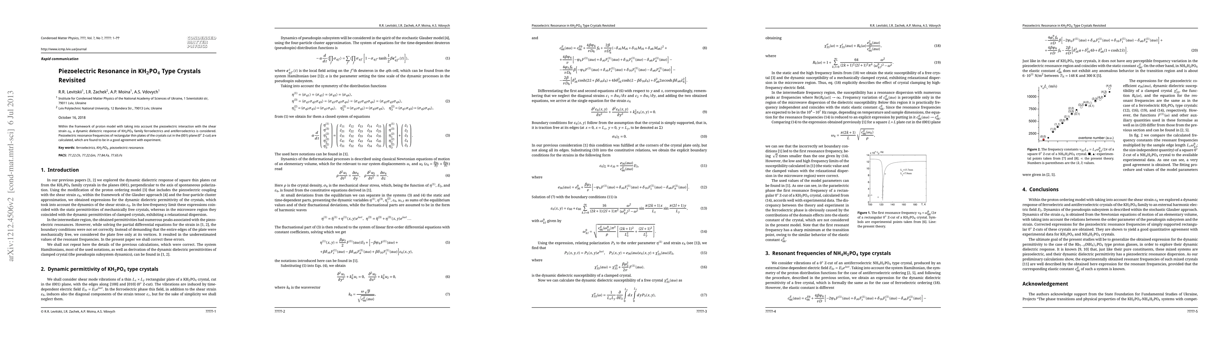 Within the framework of proton ordering model with taking into account the piezoelectric interaction with the shear strain $\varepsilon_6$, a dynamic dielectric response of KD2PO4 type ferroelectrics is considered. An expression for the piezoelectric resonance frequencies of the rectangular thin plate of the crystal cut in the (001) plane is obtained.