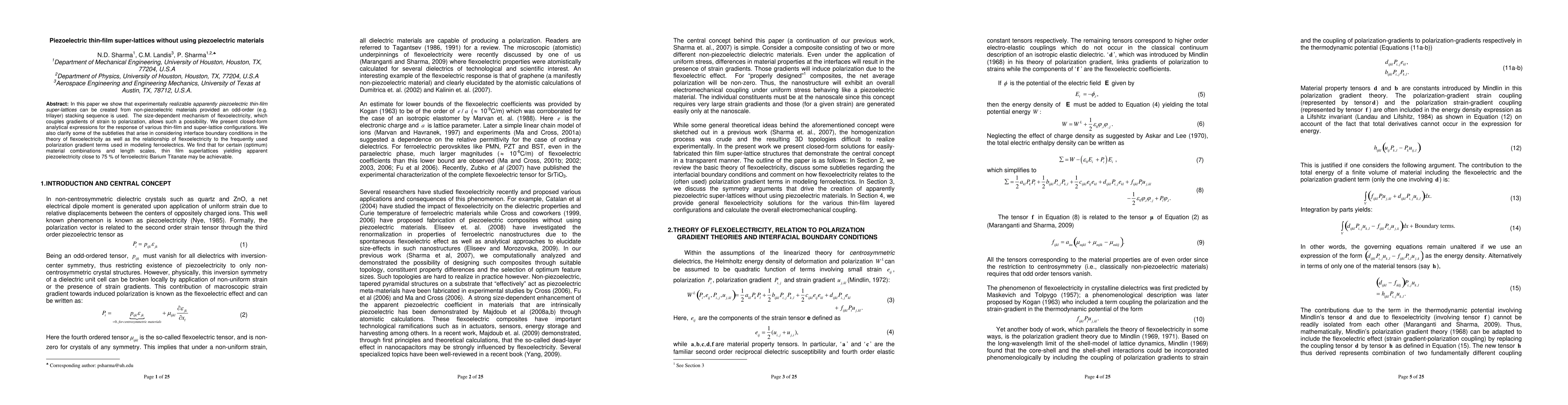 Abstract: In this paper we show that experimentally realizable apparently piezoelectric thin-film super-lattices can be created from non-piezoelectric materials provided an odd-order (e.g. trilayer) stacking sequence is used. The size-dependent mechanism of flexoelectricity, which couples gradients of strain to polarization, allows such a possibility. We present closed-form analytical expressions for the response of various thin-film and super-lattice configurations. We also clarify some of the subtleties that arise in considering interface boundary conditions in the theory of flexoelectricity as well as the relationship of flexoelectricity to the frequently used polarization gradient terms used in modeling ferroelectrics. We find that for certain (optimum) material combinations and length scales, thin film superlattices yielding apparent piezoelectricity close to 75 % of ferroelectric Barium Titanate may be achievable.