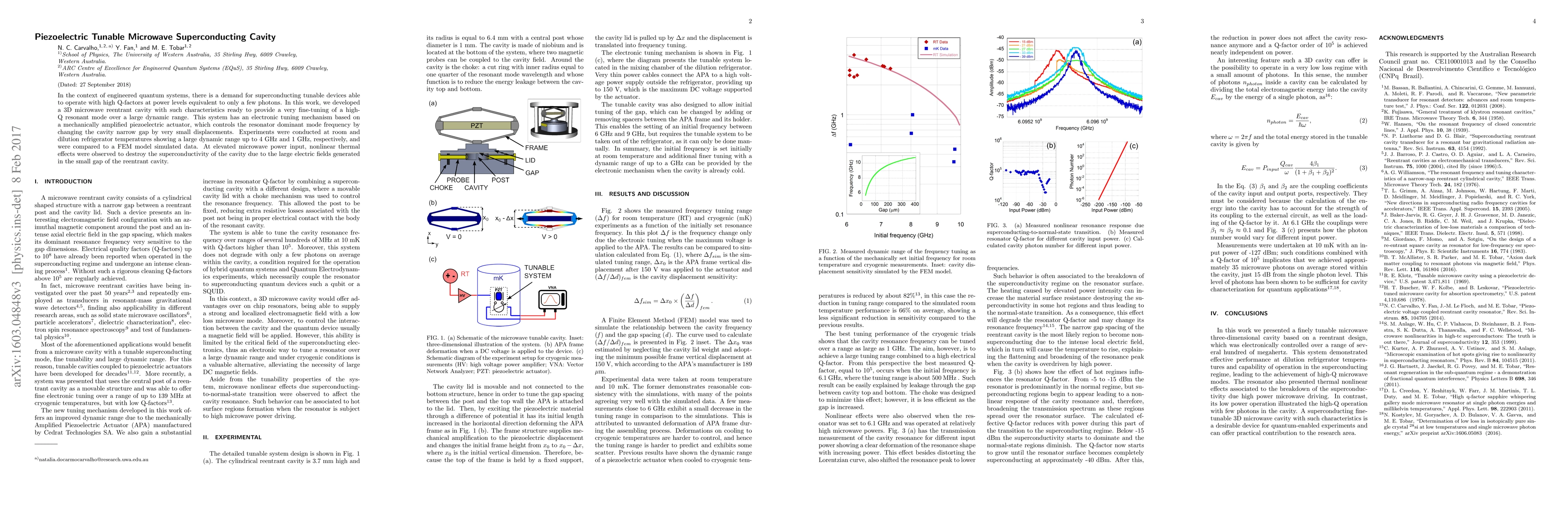 This paper presents a piezoelectric tunable superconducting microwave cavity designed for high Q-factors and fine-tuning over a large frequency range, utilizing a mechanically amplified piezoelectric actuator. Experiments demonstrated dynamic tuning ranges up to 4 GHz at room temperature and 1 GHz in a dilution refrigerator, though nonlinear thermal effects at high power levels compromised superconductivity.