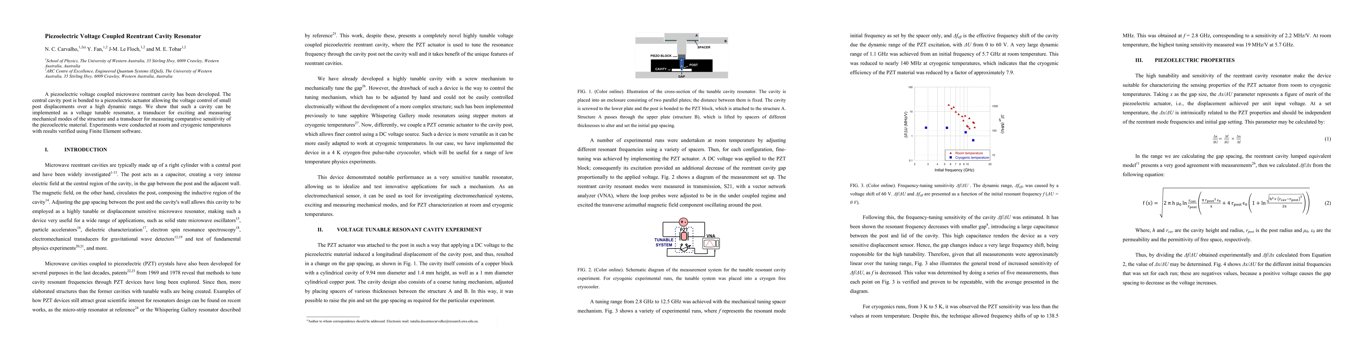 This paper develops a piezoelectric voltage-coupled microwave reentrant cavity resonator, where a central cavity post bonded to a piezoelectric actuator enables voltage-controlled displacements. The device functions as a tunable resonator, a transducer for mechanical mode excitation, and a tool for measuring the sensitivity of piezoelectric materials, with experimental validation at various temperatures.