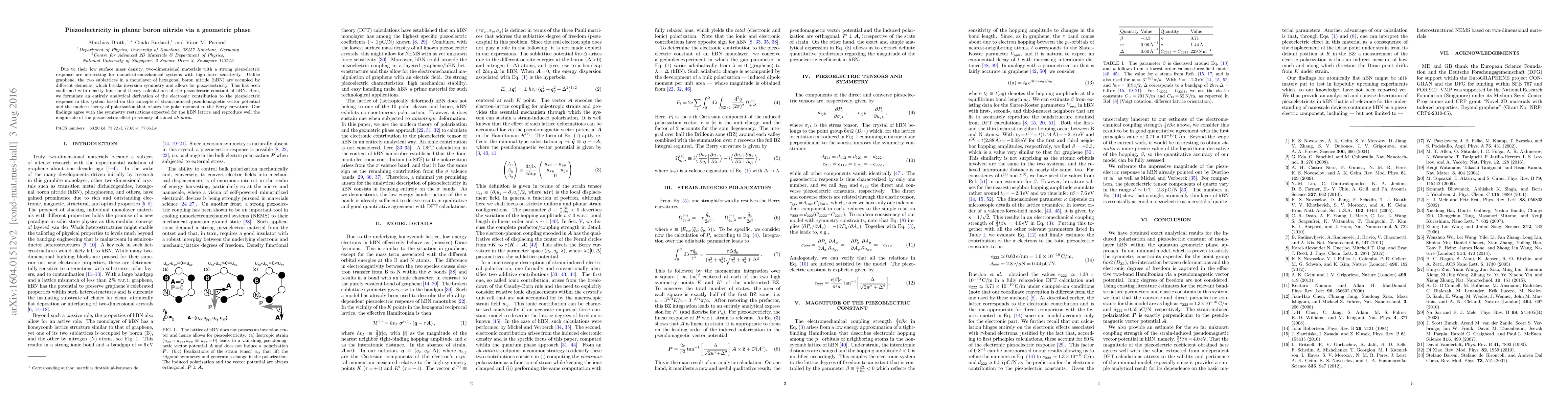 This paper analytically derives the piezoelectric response in hexagonal boron nitride (hBN) using concepts of strain-induced pseudomagnetic vector potential and modern polarization theory, confirming its piezoelectricity and matching previous ab-initio calculations. The study highlights the potential of hBN for nanoelectromechanical systems due to its strong piezoelectric effect.
