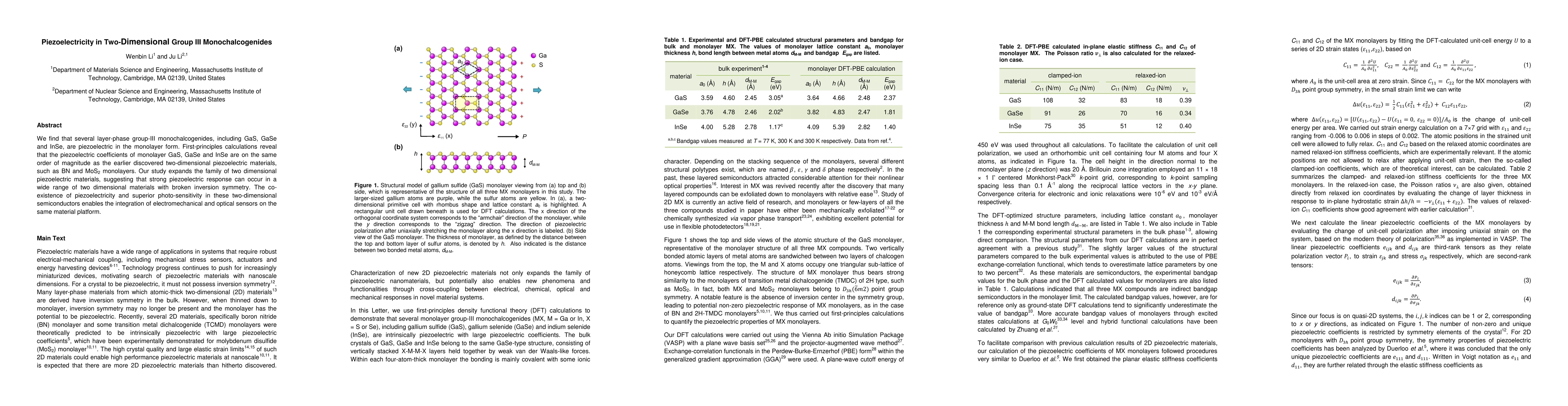 This study identifies monolayer forms of GaS, GaSe, and InSe as piezoelectric materials, with calculated piezoelectric coefficients comparable to those of BN and MoS2. It expands the range of two-dimensional piezoelectric materials and highlights their potential for integrating electromechanical and optical sensors.