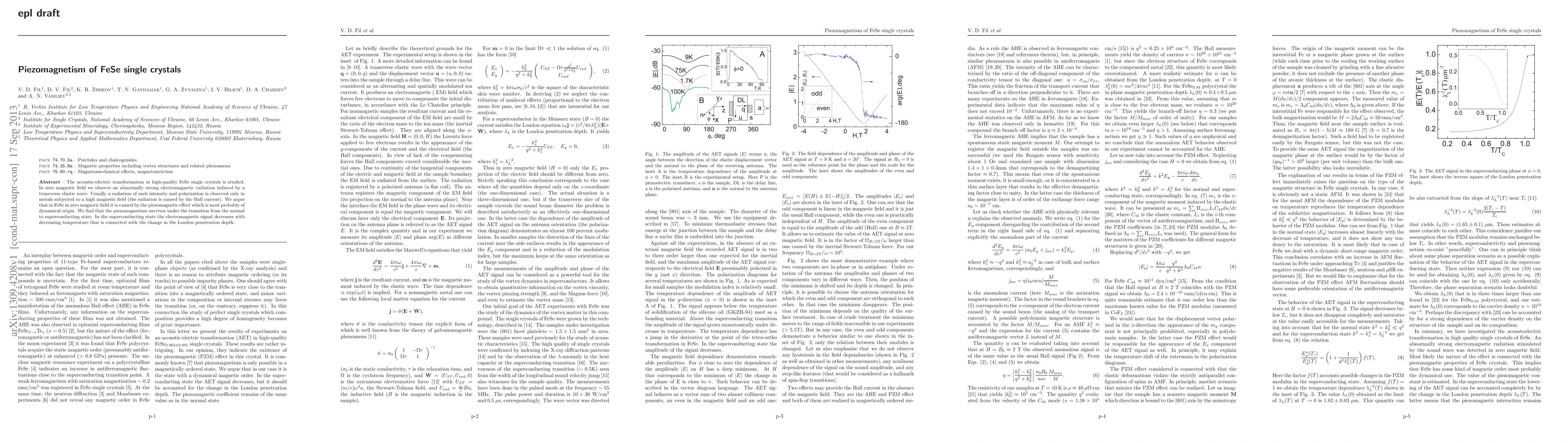 The acoustic-electric transformation in high-quality FeSe single crystals is studied. In zero magnetic field we observe an abnormally strong electromagnetic radiation induced by a transverse elastic wave. Usually a radiation of such intensity and polarization is observed only in metals subjected to a high magnetic field (the radiation is caused by the Hall current). We argue that in FeSe in zero magnetic field it is caused by the piezomagnetic effect which is most probably of dynamical origin. We find that the piezomagnetism survives under the transition from the normal to superconducting state. In the superconducting state the electromagnetic signal decreases with decreasing temperature that is connected with the change in the London penetration depth.