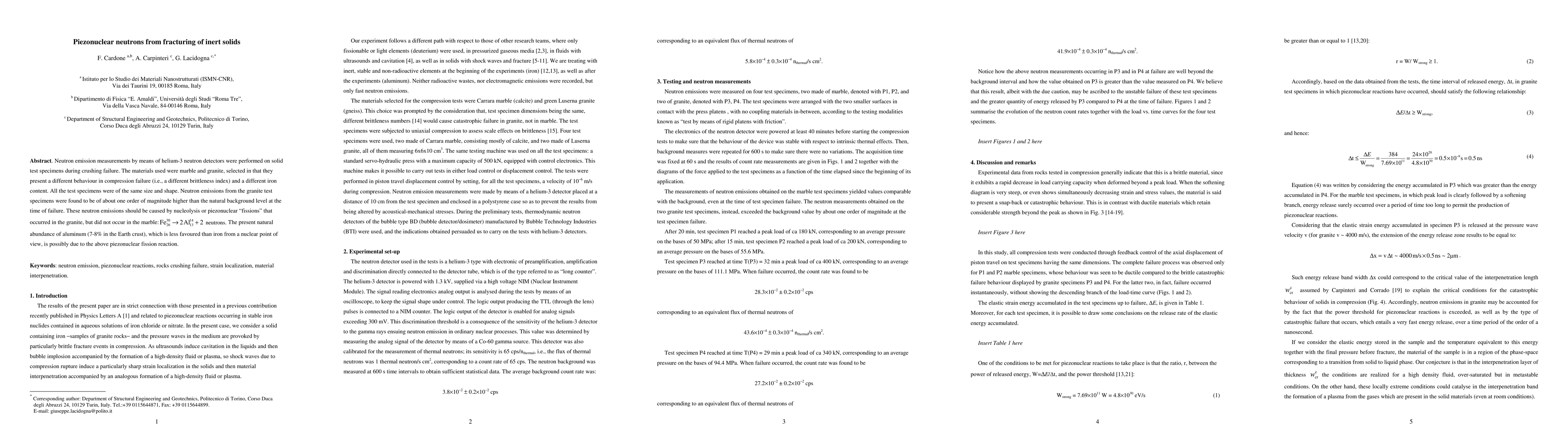 Neutron emission measurements by means of helium-3 neutron detectors were performed on solid test specimens during crushing failure. The materials used were marble and granite, selected in that they present a different behaviour in compression failure (i.e., a different brittleness index) and a different iron content. All the test specimens were of the same size and shape. Neutron emissions from the granite test specimens were found to be of about one order of magnitude higher than the natural background level at the time of failure.