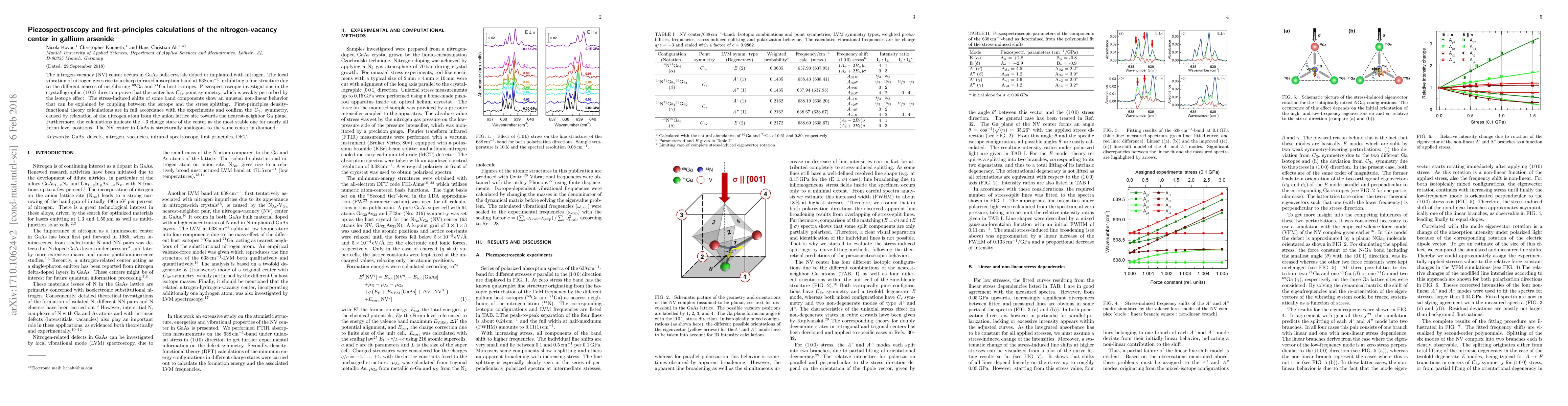 This paper investigates the nitrogen-vacancy (NV) center in gallium arsenide (GaAs) using piezospectroscopy and first-principles calculations, revealing a C$_\text{3v}$ point symmetry and non-linear stress-induced shifts due to isotope-stress coupling. The findings are corroborated by density-functional theory, showing the NV center's structural analogy to that in diamond.