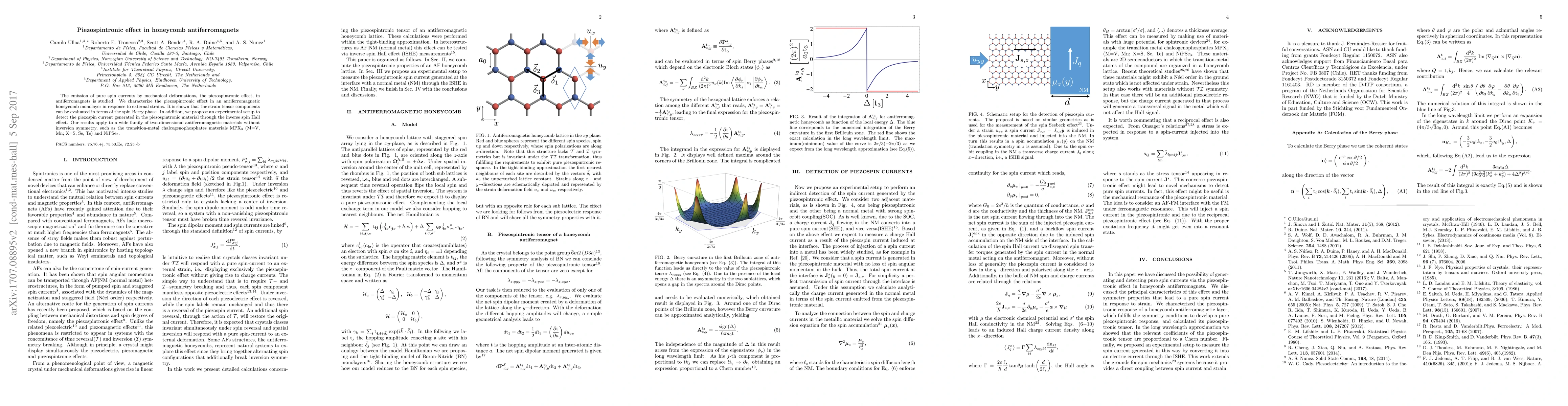 The emission of pure spin currents by mechanical deformations, the piezospintronic effect, in antiferromagnets is studied. We characterize the piezospintronic effect in an antiferromagnetic honeycomb monolayer in response to external strains. It is shown that the strain tensor components can be evaluated in terms of the spin Berry phase. In addition, we propose an experimental setup to detect the piezo-spin current generated in the piezospintronic material through the inverse spin Hall effect. Our results apply to a wide family of two-dimensional antiferromagnetic materials without inversion symmetry, such as the transition-metal chalcogenophosphates materials MPX3 (M=V, Mn; X=S, Se, Te) and NiPSe3.