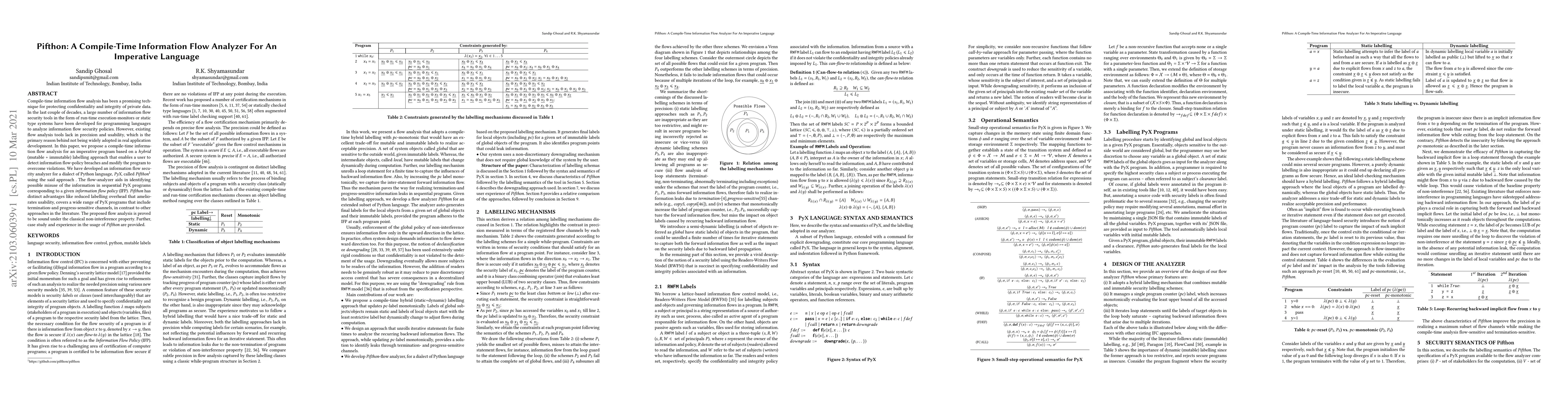 This paper proposes Pifthon, a compile-time information flow analyzer for an imperative dialect of Python, PyX, using a hybrid labelling approach to enhance precision and usability. It aims to detect and correct information flow policy breaches, offering advantages like reduced labelling overhead and broader program coverage.