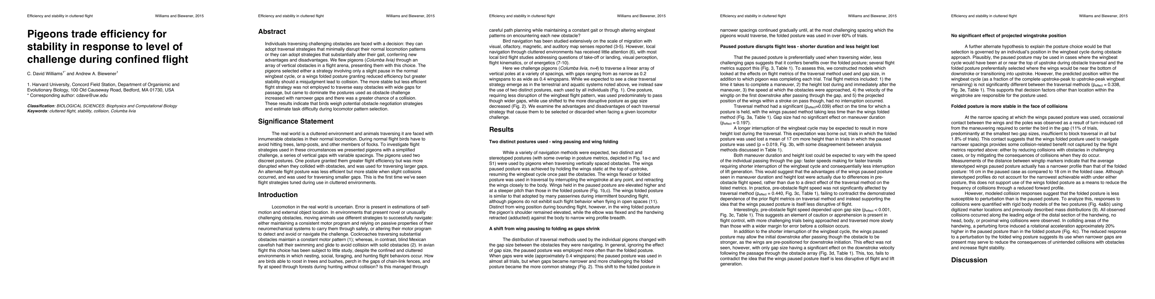 Pigeons choose between efficient but unstable flight strategies and less efficient but more stable ones when navigating obstacles, with stability becoming more important as challenge increases.