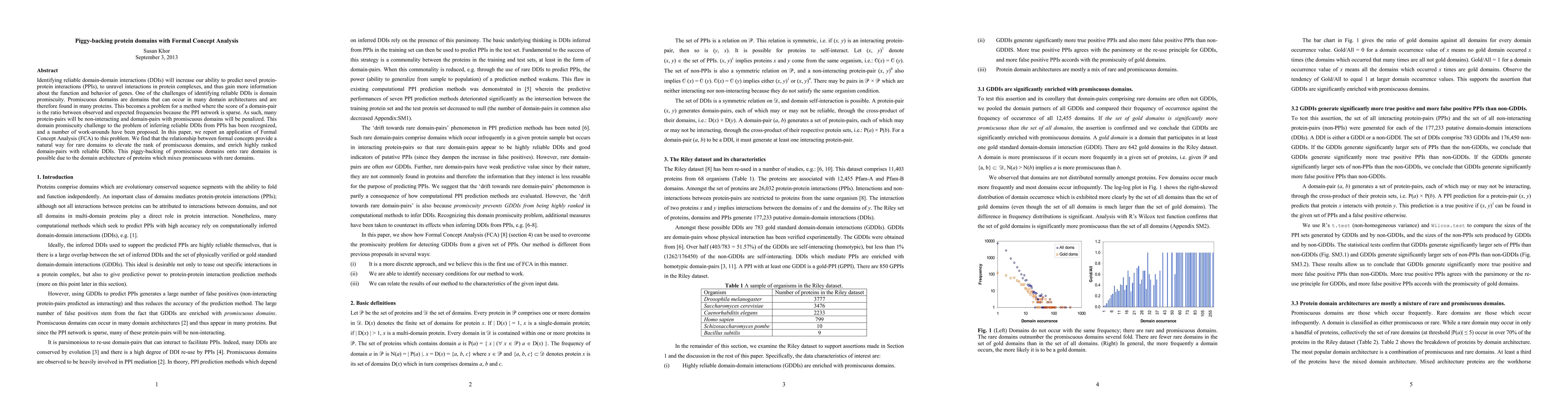 This paper applies Formal Concept Analysis to identify reliable domain-domain interactions, addressing the challenge of domain promiscuity by allowing promiscuous domains to "piggy-back" on rare domains, thereby enhancing the ranking of interactions and improving predictions of protein-protein interactions.