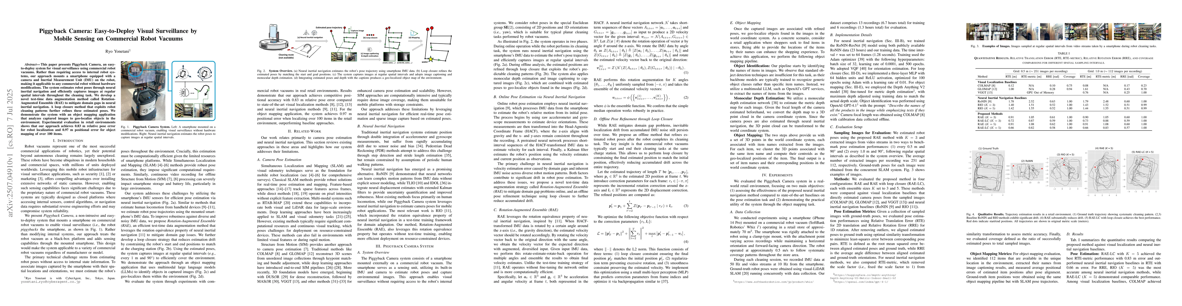 This paper presents Piggyback Camera, an easy-to-deploy system for visual surveillance using commercial robot vacuums. Rather than requiring access to internal robot systems, our approach mounts a smartphone equipped with a camera and Inertial Measurement Unit (IMU) on the robot, making it applicable to any commercial robot without hardware modifications. The system estimates robot poses through neural inertial navigation and efficiently captures images at regular spatial intervals throughout the cleaning task. We develop a novel test-time data augmentation method called Rotation-Augmented Ensemble (RAE) to mitigate domain gaps in neural inertial navigation. A loop closure method that exploits robot cleaning patterns further refines these estimated poses. We demonstrate the system with an object mapping application that analyzes captured images to geo-localize objects in the environment. Experimental evaluation in retail environments shows that our approach achieves 0.83 m relative pose error for robot localization and 0.97 m positional error for object mapping of over 100 items.
