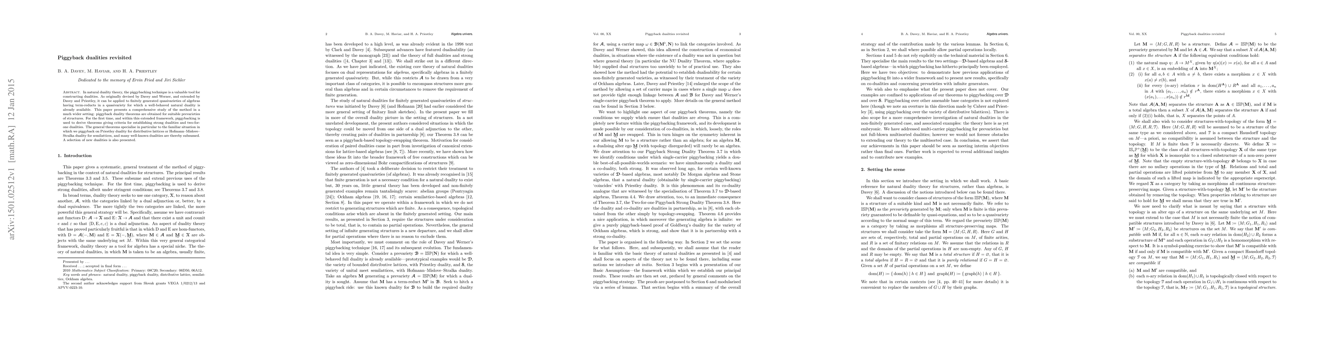 In natural duality theory, the piggybacking technique is a valuable tool for constructing dualities. As originally devised by Davey and Werner, and extended by Davey and Priestley, it can be applied to finitely generated quasivarieties of algebras having term-reducts in a quasivariety for which a well-behaved natural duality is already available. This paper presents a comprehensive study of the method in a much wider setting: piggyback duality theorems are obtained for suitable prevarieties of structures. For the first time, and within this extended framework, piggybacking is used to derive theorems giving criteria for establishing strong dualities and two-for-one dualities. The general theorems specialise in particular to the familiar situation in which we piggyback on Priestley duality for distributive lattices or Hofmann--Mislove--Stralka duality for semilattices, and many well-known dualities are thereby subsumed. A selection of new dualities is also presented.