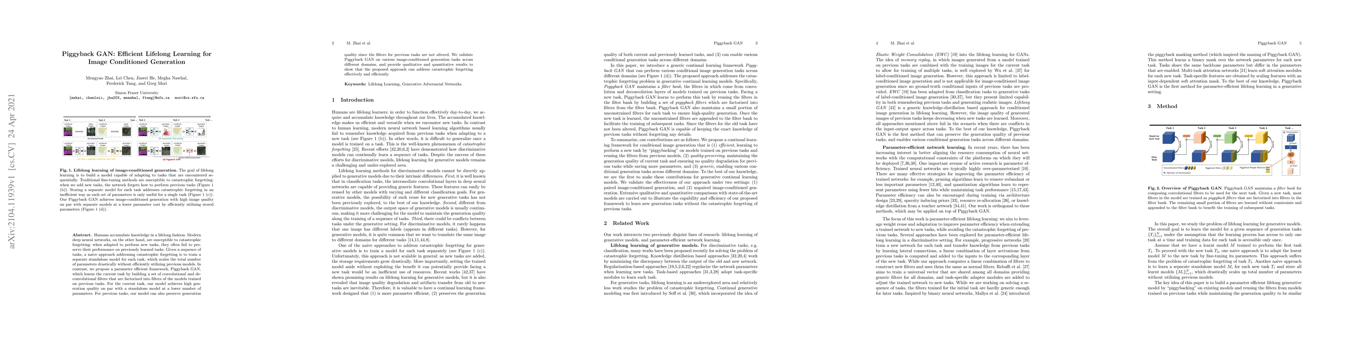 Piggyback GAN proposes a parameter-efficient framework for lifelong learning that mitigates catastrophic forgetting by factorizing convolutional filters from previous models, allowing efficient adaptation to new tasks without degrading performance on old tasks. This approach achieves high generation quality with a lower parameter count compared to standalone models.