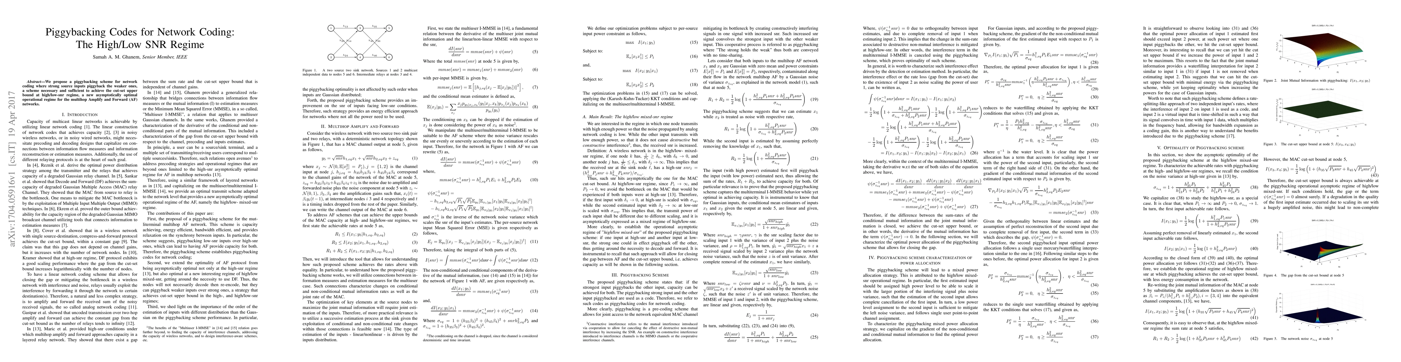 Summary: This paper introduces a piggybacking scheme for network coding that allows strong signals to utilize weaker ones, achieving the cut-set upper bound in high/low-SNR conditions, thereby optimizing performance in multihop Amplify and Forward networks.