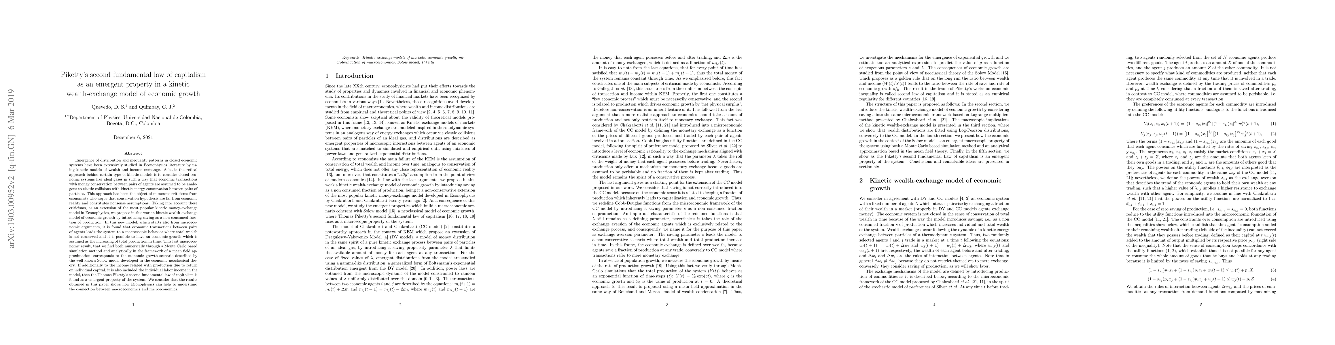 This paper introduces a kinetic wealth-exchange model incorporating saving and labor income, demonstrating that economic growth and Piketty's second fundamental law of capitalism emerge as macroscopic properties from microeconomic interactions. The findings bridge macroeconomic and microeconomic dynamics through an econophysics approach.