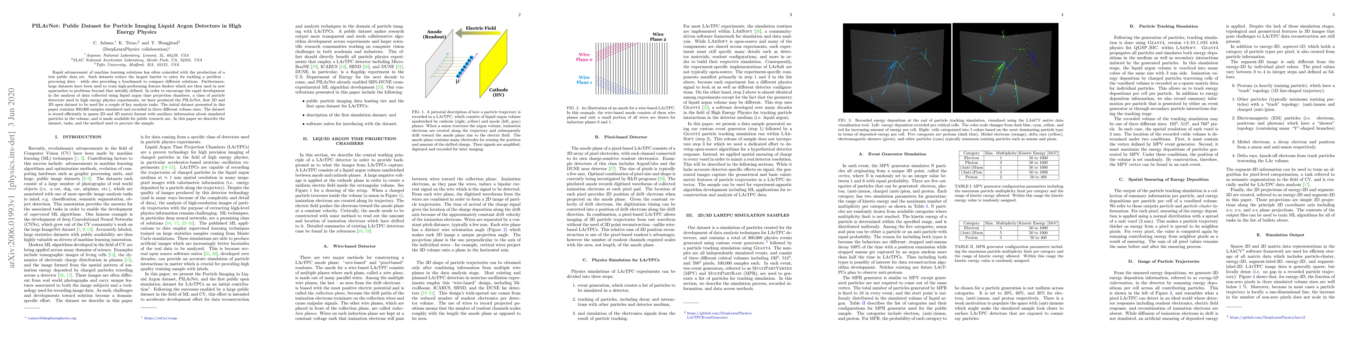 The research presents PILArNet, a public dataset for particle imaging liquid argon detectors (LArTPCs) in high energy physics, created using Geant4 and LArSoft. The dataset comprises 300,000 simulated particle events across three different volume sizes (192³, 512³, and 768³ pixels) with a 3mm voxel resolution.