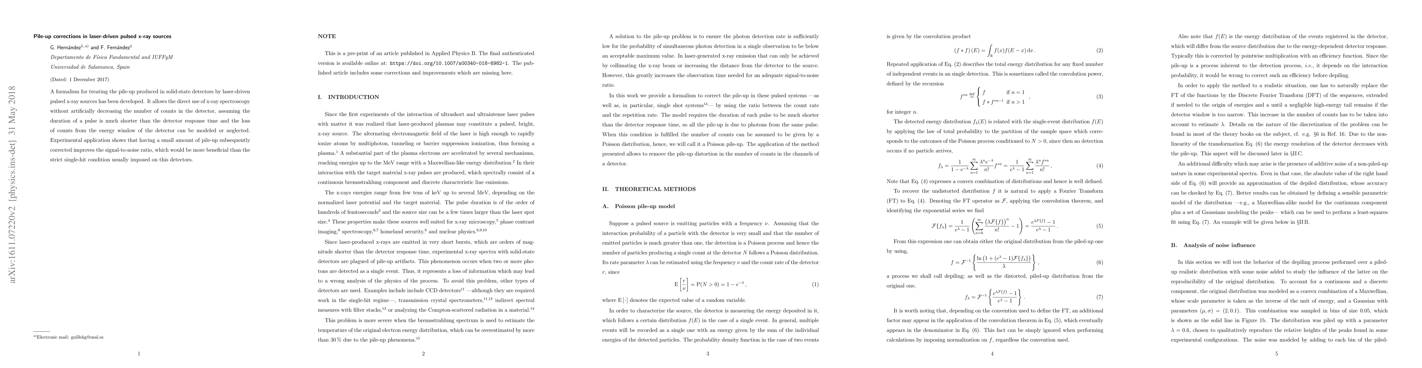 A formalism for treating the pile-up produced in solid-state detectors by laser-driven pulsed x-ray sources has been developed. It allows the direct use of x-ray spectroscopy without artificially decreasing the number of counts in the detector, assuming the duration of a pulse is much shorter than the detector response time and the loss of counts from the energy window of the detector can be modeled or neglected. Experimental application shows that having a small amount of pile-up subsequently corrected improves the signal-to-noise ratio, which would be more beneficial than the strict single-hit condition usually imposed on this detectors.